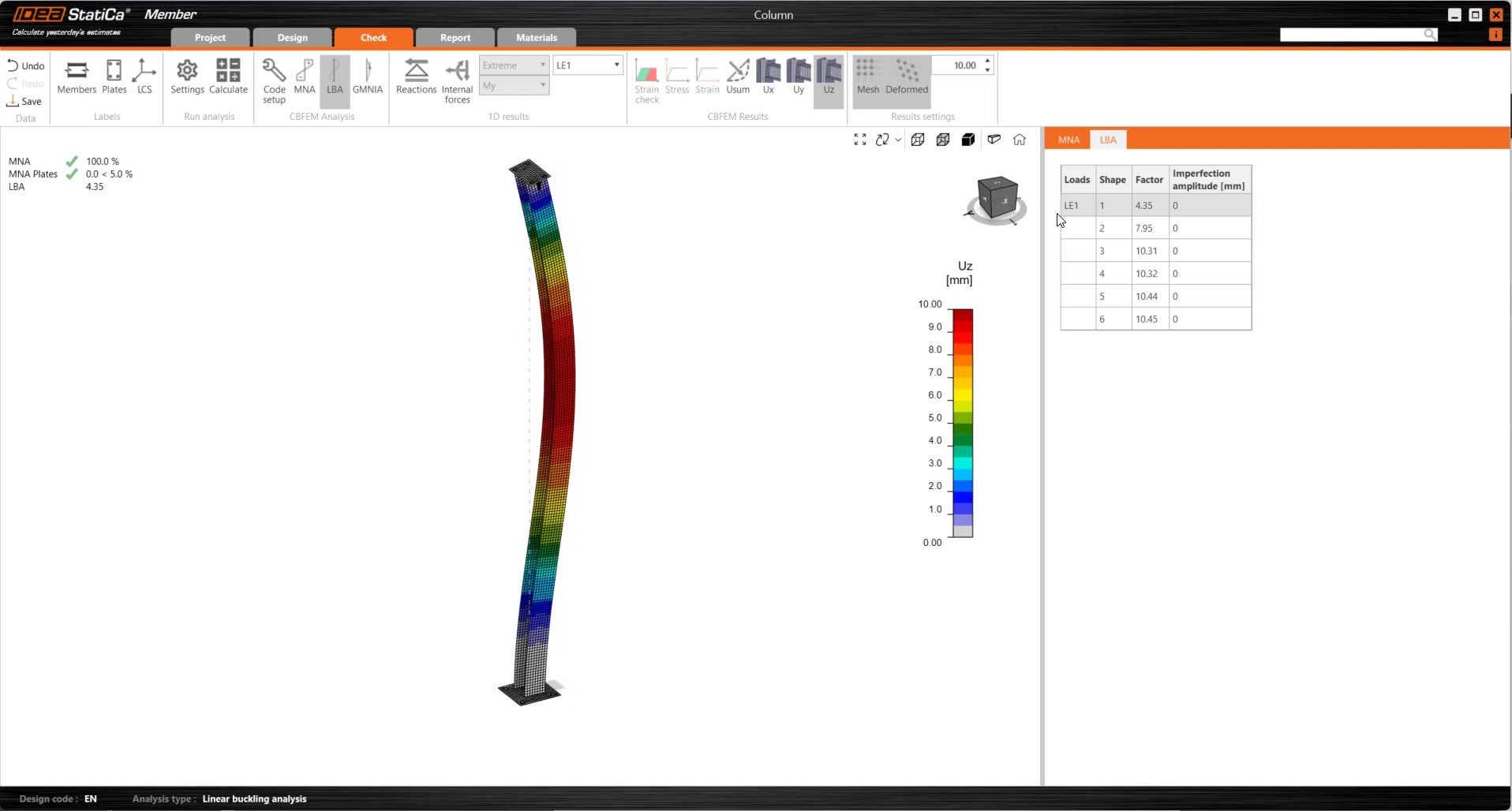 In IDEA StatiCa Member, the member is analysed for global and local buckling. After the software runs the various iterations, the critical load multiplier (buckling factor) is calculated for each buckling shape. If the critical load multiplier is above the recommended value from the standard, the code does not require a further assessment. However, if the buckling factor is lower than the recommended value, 2nd order effects consideration or using a more advanced approach is required.