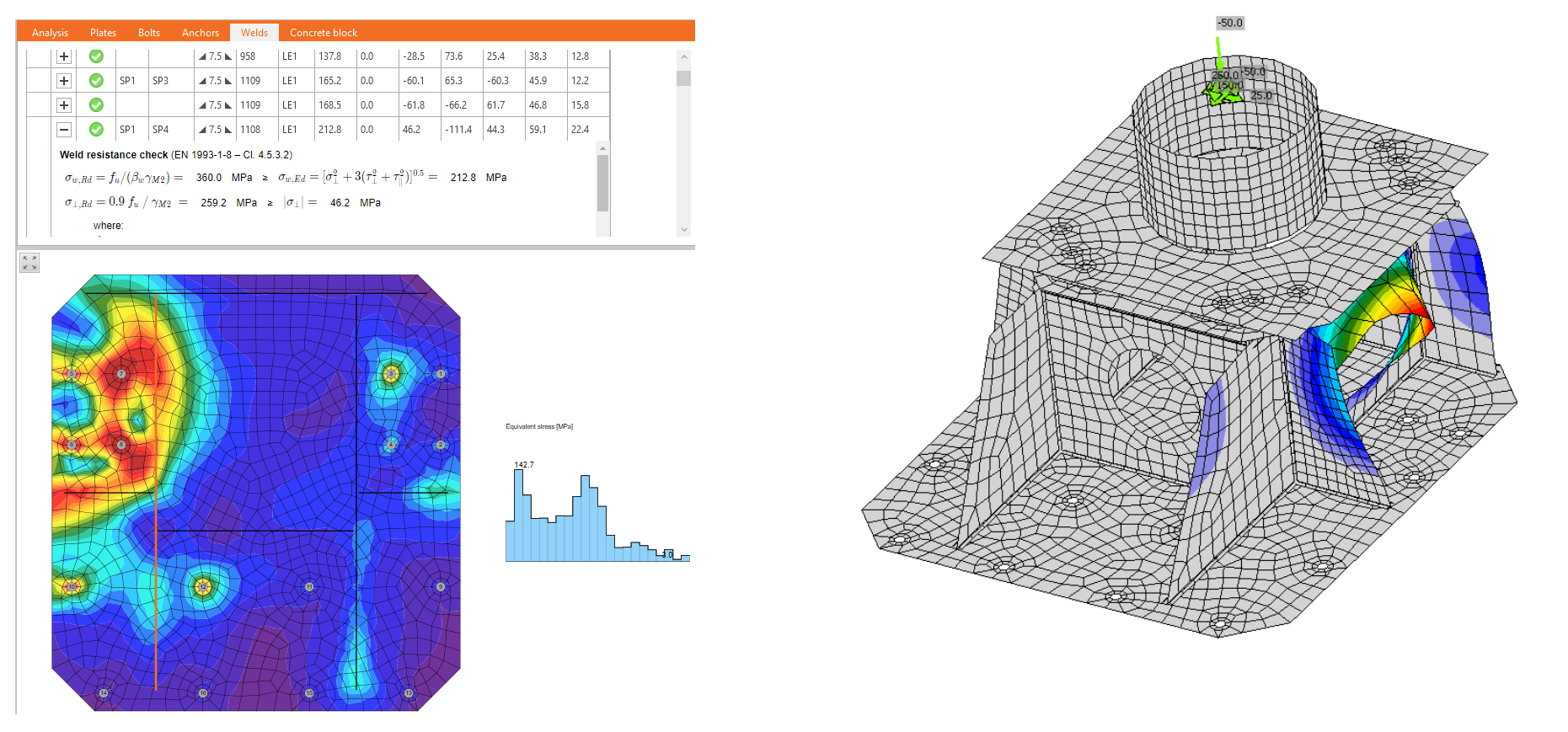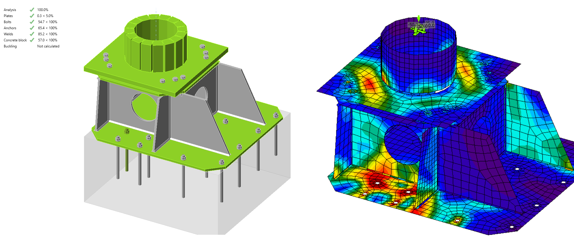 The complex pedestal transfers all the critical combinations and fulfills the criteria according to the Eurocode. The model has undertaken a stress-strain and buckling analysis to validate all aspects of the design. The IDEA StatiCa Connection app also brings big potential for the mechanical engineering field, where it can assist as the software for the design and code-check of pedestals for mechanical robotic arms.