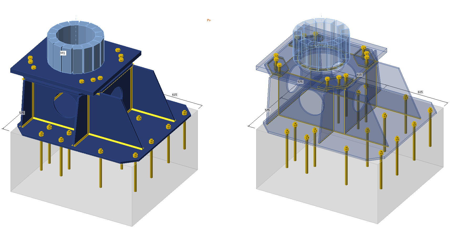 The model is assembled from a base plate anchored to a concrete block. The pedestal box with openings is stiffened using welded stiffeners. The model ensures spatial stability and rigidity. The complexity of the anchoring model can be seen in both a solid and transparent view.
