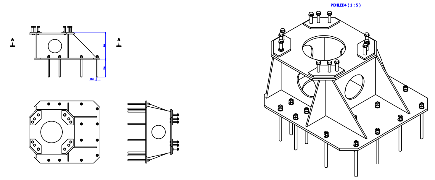 The mechanical part of the model must be fixed to a rigid pedestal to minimize deformation for correct manipulation during assembly. It leads to the need for a precise design, analysis, and code-checking. All the components that together form the support of the mechanical parts, like plates, bolts, and welds, ensure the spatial stiffness of the substructure and its need to be analyzed precisely.