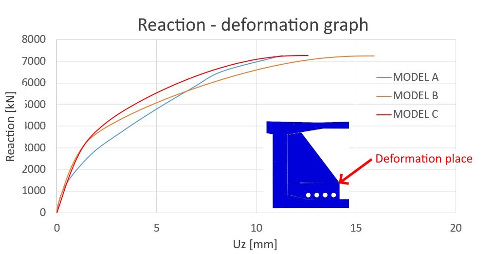 Proof of the model's complex behavior is demonstrated through the reaction-deformation curve. The displacement extraction point has been predetermined within the deviator and stiffening wall area. The correct interpretation of results requires an unbiased approach. Consideration of the tensile strength in the concrete itself has caused discrepancies between models B and C and simplified model A. The simplified model A neglects the tensile strength of concrete. The tension-stiffening effect is only applied on the reinforcement bars material diagram. The design strength in tension of models B and C has been considered as 1.6 MPa based on Thorenfeldt [4], which is approximately 0.3 MPa lower compared to the design strength in tension according to EN 1992-1-1[3]. The resultant reaction has passed the ultimate limit state criteria.
