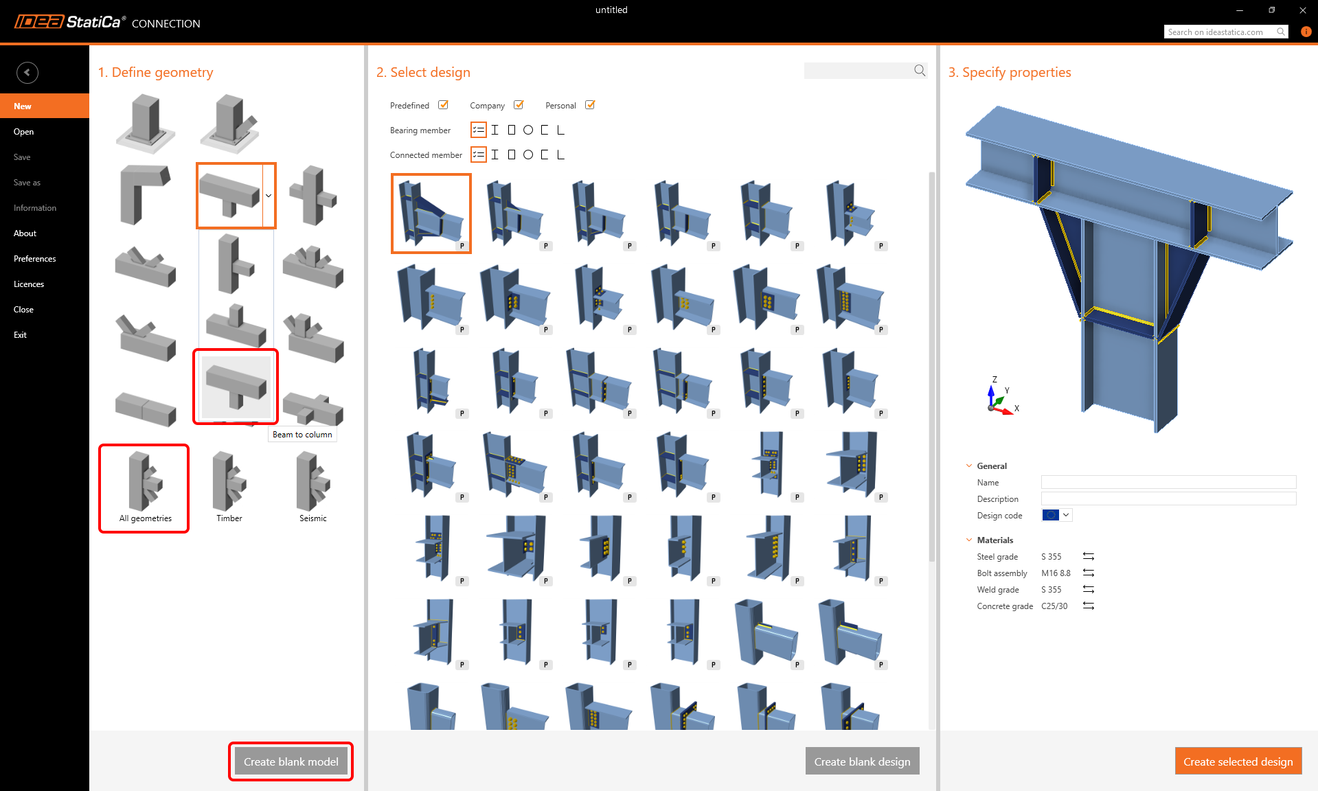 The wizard provides a starting point for your new model, offering solutions for a junior and advanced user of the Connection app. It provides a set of new parametric templates covering standard connections of all different geometries and types. The company and personal sets are incorporated into the wizard so that the user can start right away with their custom template.