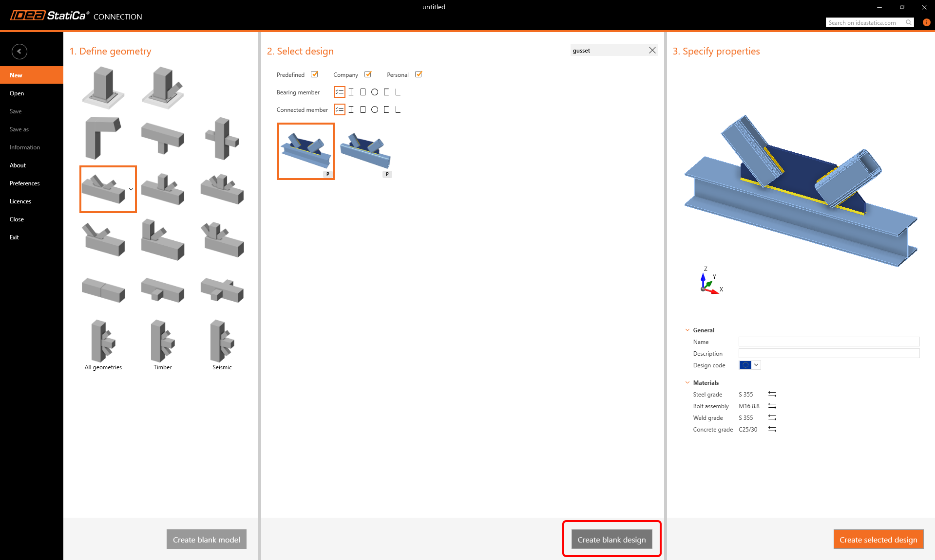 Again, to create an empty design project (with the given geometry), you can use the Create blank design button at the bottom of this section.