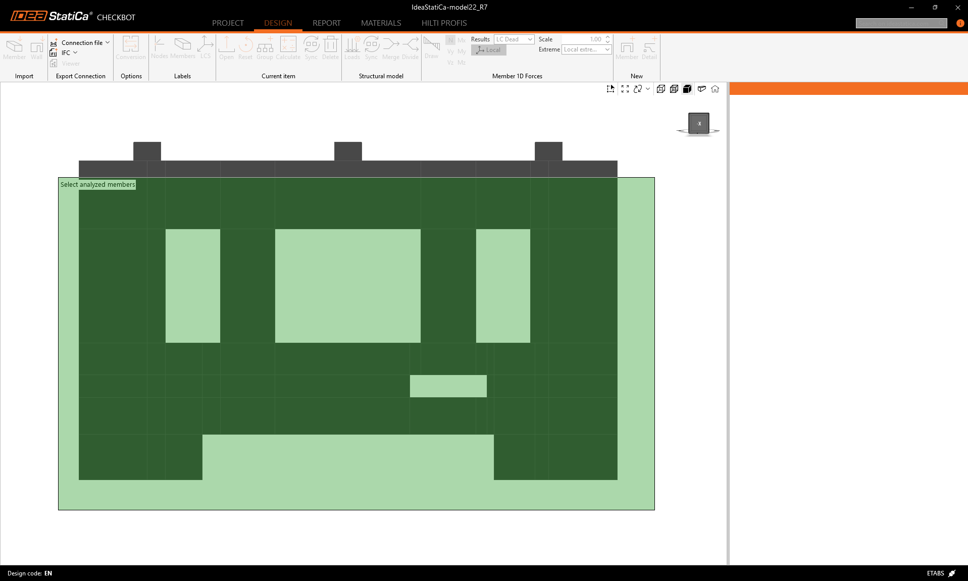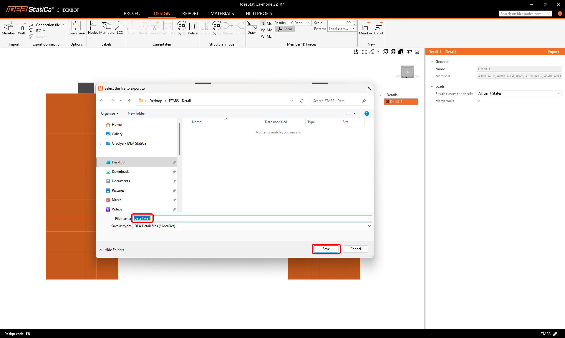 During the export, the following warning message can appear. Be aware that IDEA StatiCa Detail 2D works with a vertical wall model and only calculates with in-plane loading. Any out-of-plane effects coming from ETABS will be neglected. The warning message contains the values of the neglected out-of-plane loads and the corresponding load cases as well.