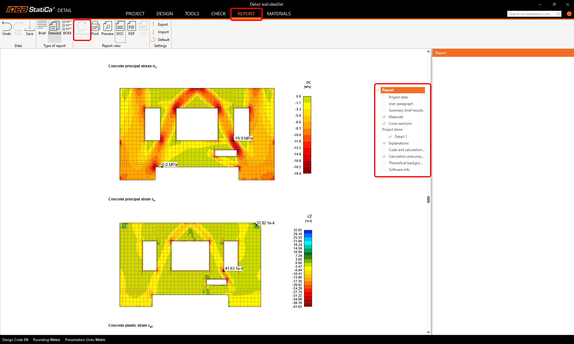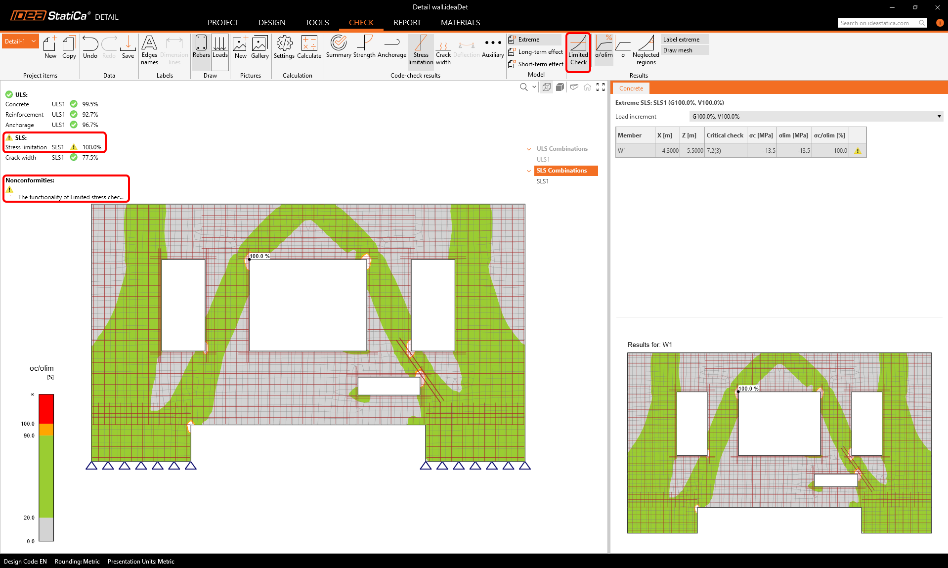 Because the stress in concrete exceeds the limit stress only in small regions around the sharp corners, we can turn on the Limited Check functionality in the top ribbon. In numerical calculations, it is typical that stress peaks (singularities) form around sharp corners. In such cases, we can exclude those areas from the code-checks. This means that we will see 100% results for the stress limitation check, completed with a nonconformity message that explains the usage of limited checks. Find out more about the Limited Check in this article