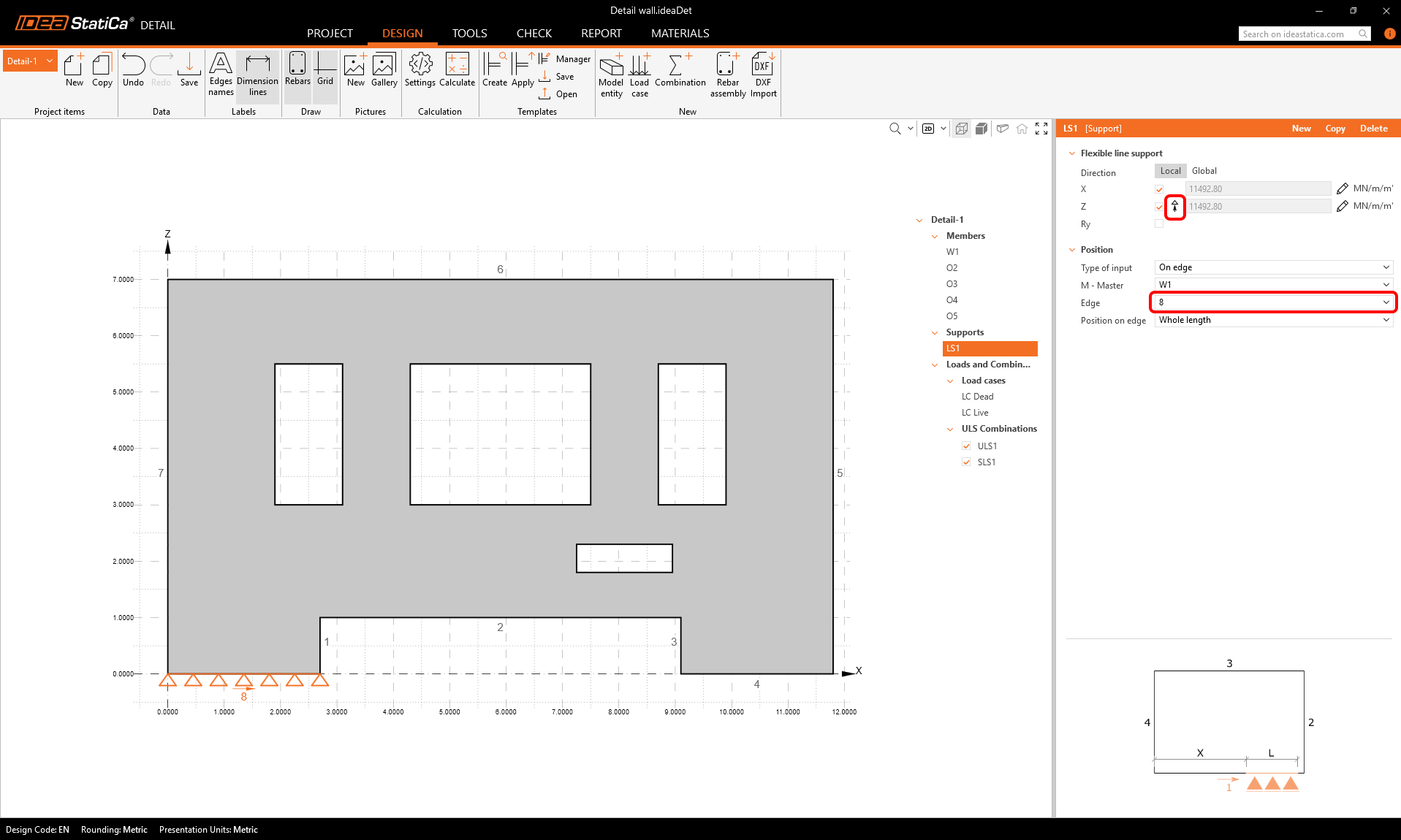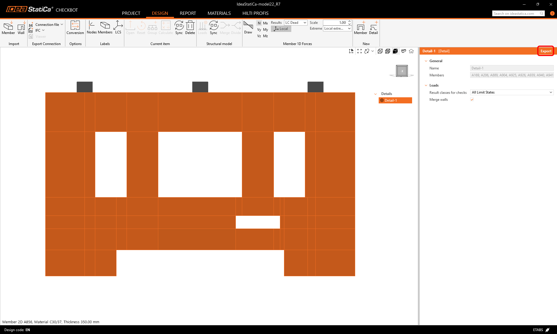 Detail calculates only with in-plane loads. To ensure that the wall transfers mainly in-plane loading, we can reduce the out-of-plane stiffness of the wall in ETABS. This will secure realistic load redistribution and Detail receives in-plane forces.