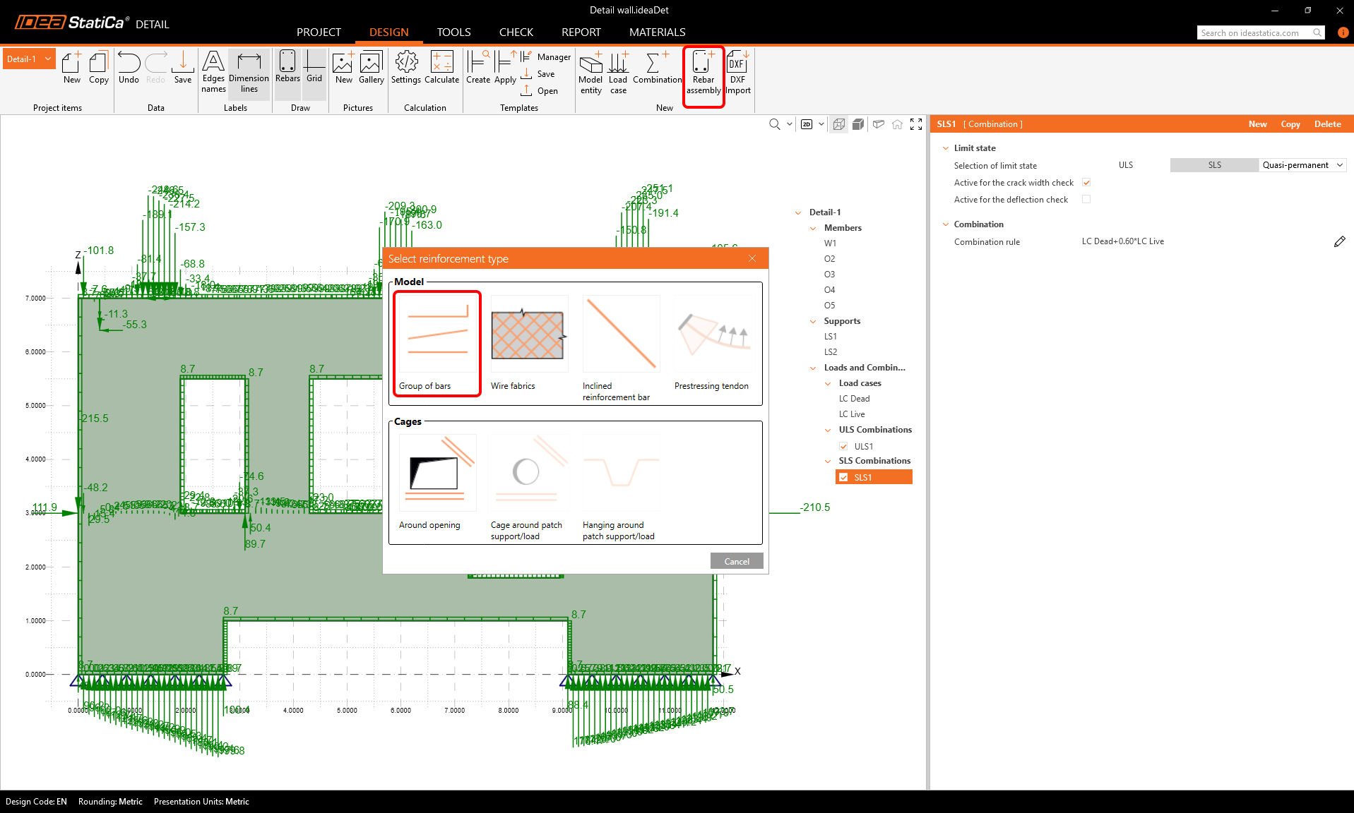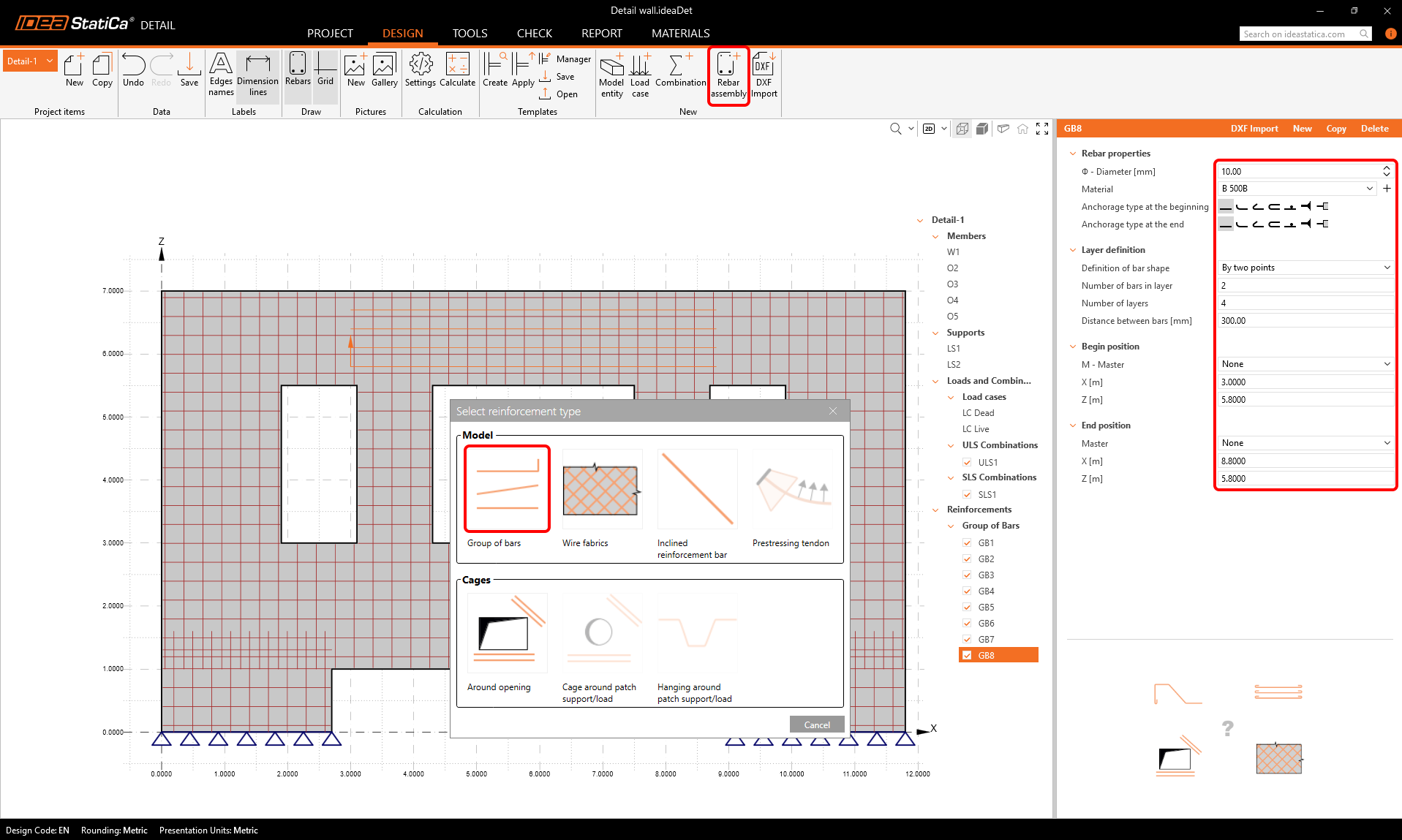 Now we can move on to inputting some reinforcement into the model. Let's click Rebar assembly in the ribbon and choose a Group of bars