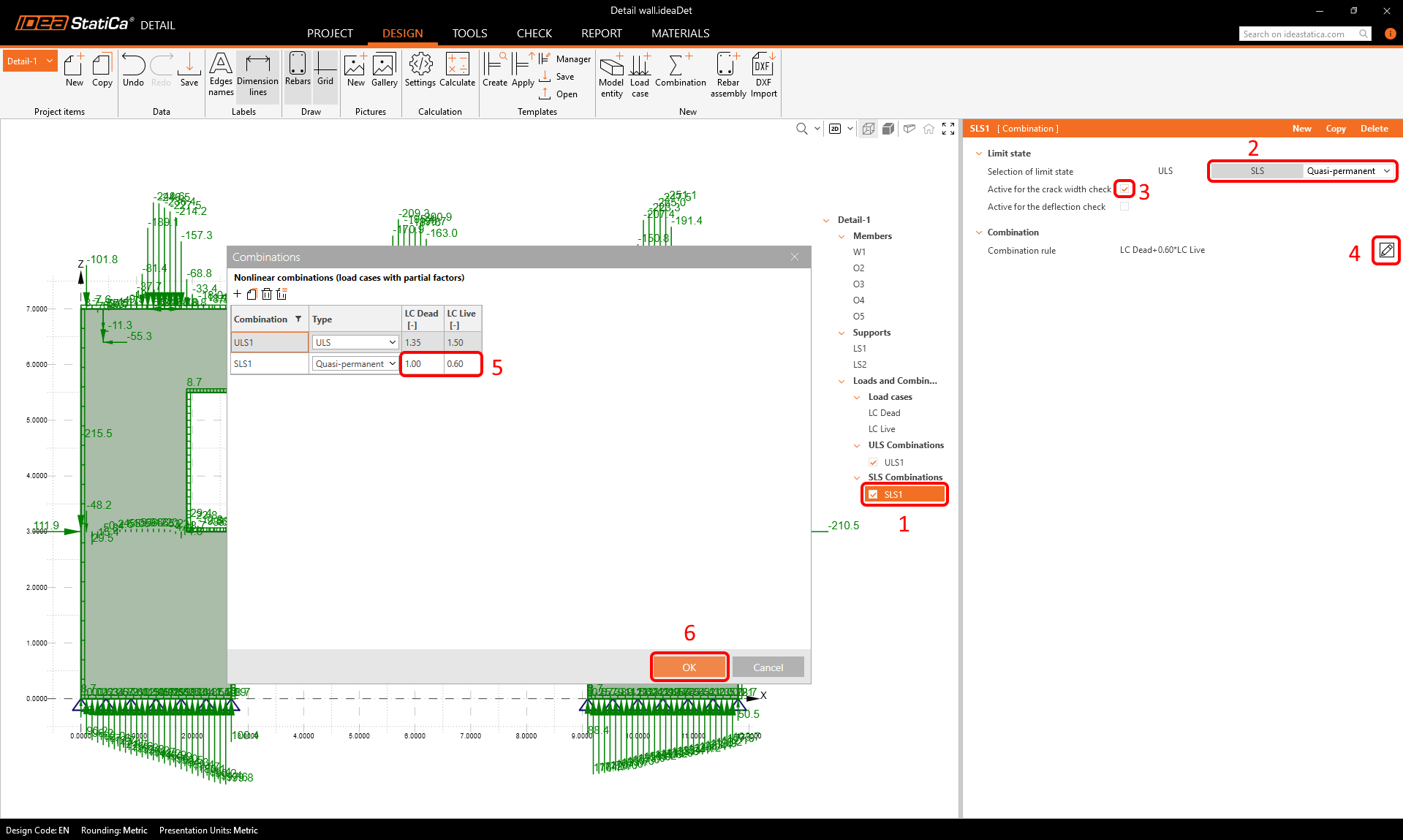 The second one should be an SLS combination. Let's change the settings of that combination, make it a Quasi-permanent one, active for crack width check, and set the load factors