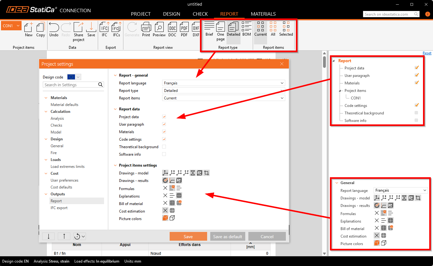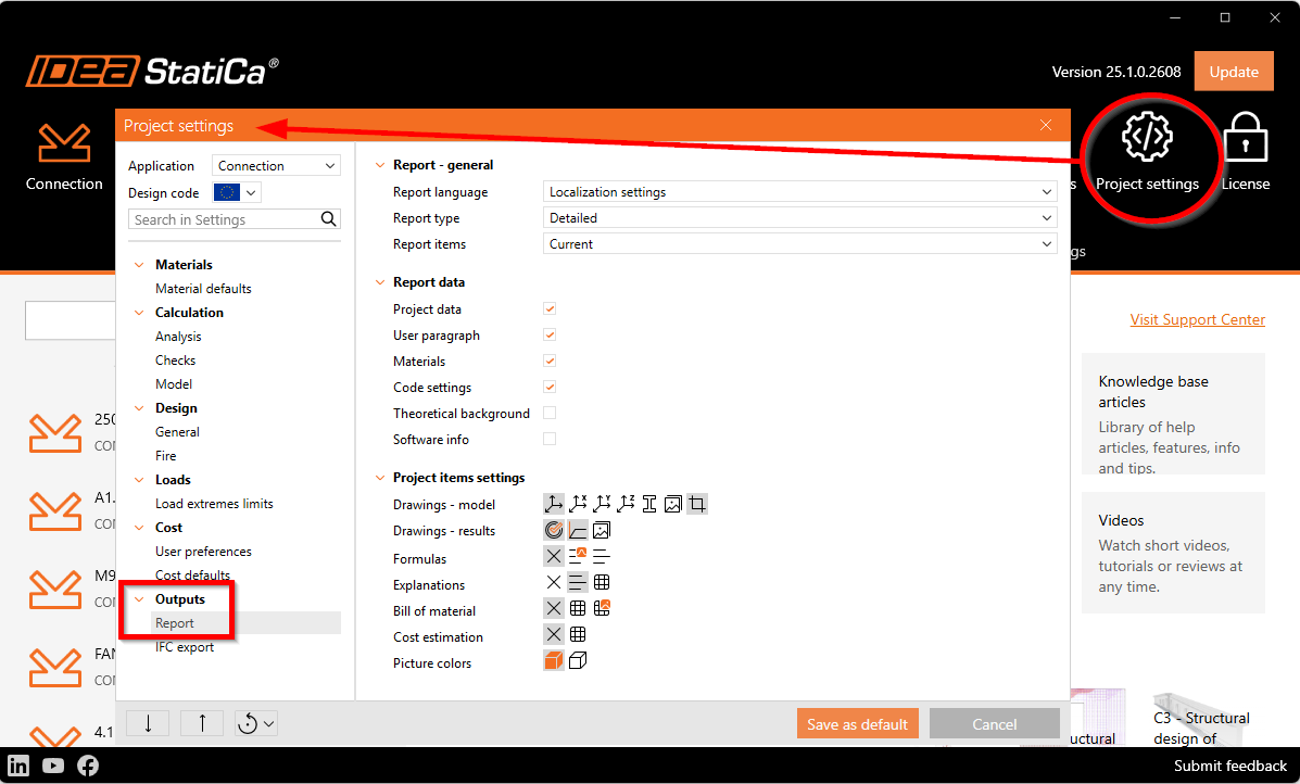 Report settings can now be saved as default configurations and reused across all IDEA StatiCa Connection and Checkbot projects. Users can define preferred report parameters, language, format, scope, and detail level, once and apply them automatically to new projects.
