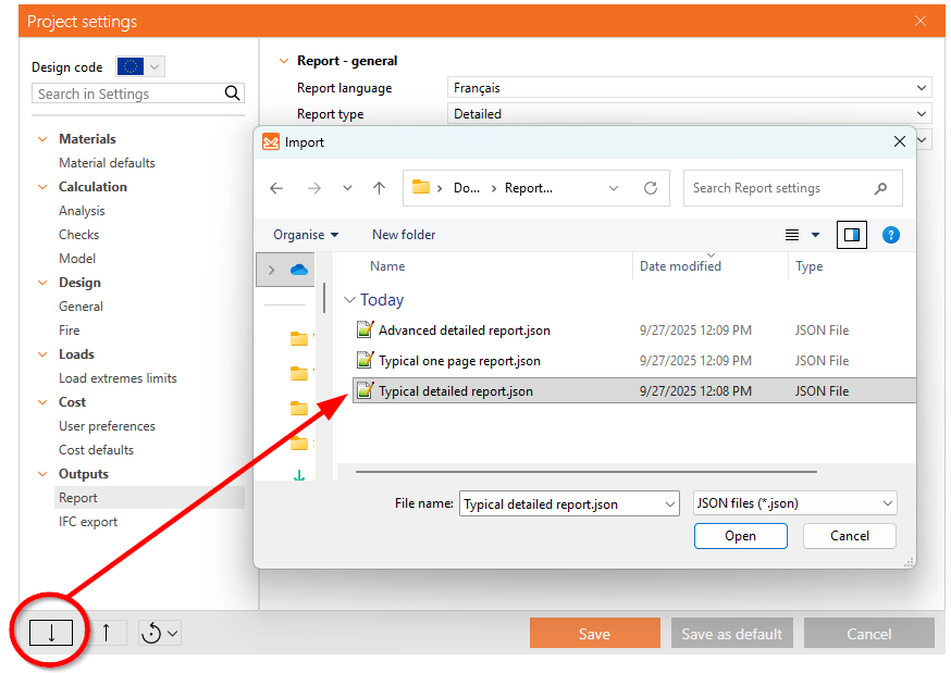 The Import function allows consistent use of these configurations across teams or projects, ensuring uniform report generation company-wide. Only the Outputs part of the settings that was exported is imported.