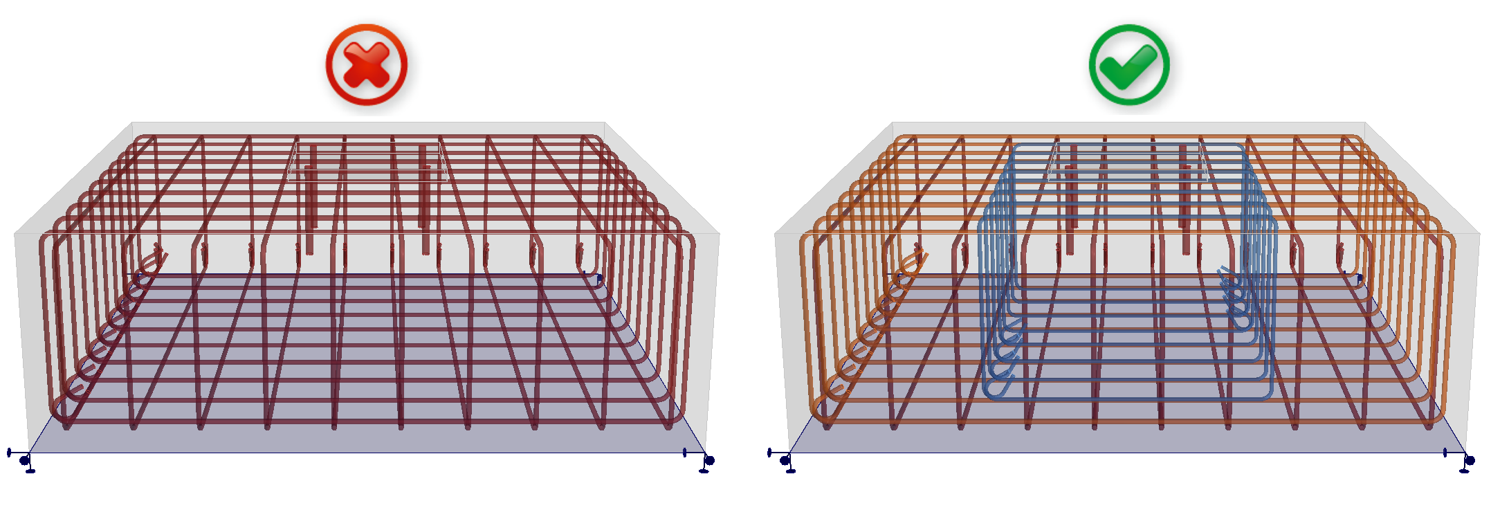 Por lo tanto, es necesario modelar estructuras que cumplan los requisitos de las normas de detalle definidas en los códigos , especialmente la distancia máxima de las barras de armadura. En la siguiente figura se puede ver dónde empieza a ser fiable el método. El modelo de la izquierda no contiene ningún estribo en el volumen alrededor de los anclajes. El modelo se calculará correctamente, pero los resultados pueden ser engañosos porque la distancia máxima de las patas de estribo está lejos de cumplirse. En cambio, en el modelo de la derecha se cumple esta regla y los resultados serán correctos.