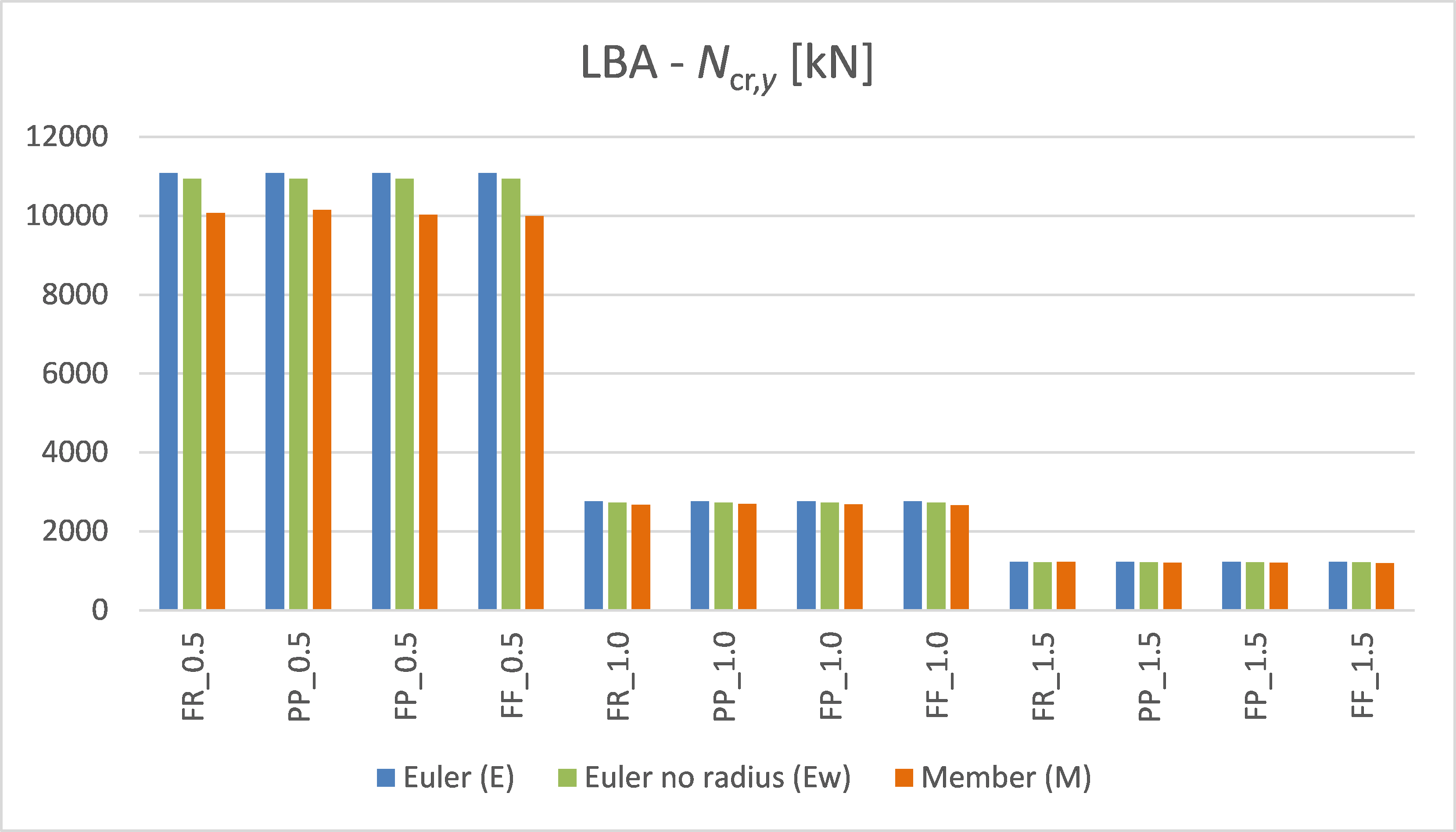 A total of 24 individual cases were analyzed to verify the LBA module. All of them share the same cross-section HEB 200 and the same steel grade S 355. Four different boundary conditions were investigated (FF; PP; FP; FF), each with varying values of columns relative slenderness (0.5; 1.0; 1.5). Buckling in direction of both principal axes is verified.