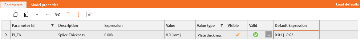 To check whether the parameter is active, see the Tab Model properties. Now, you can click on Set to model. The plates will take over our new value 0.008 m.