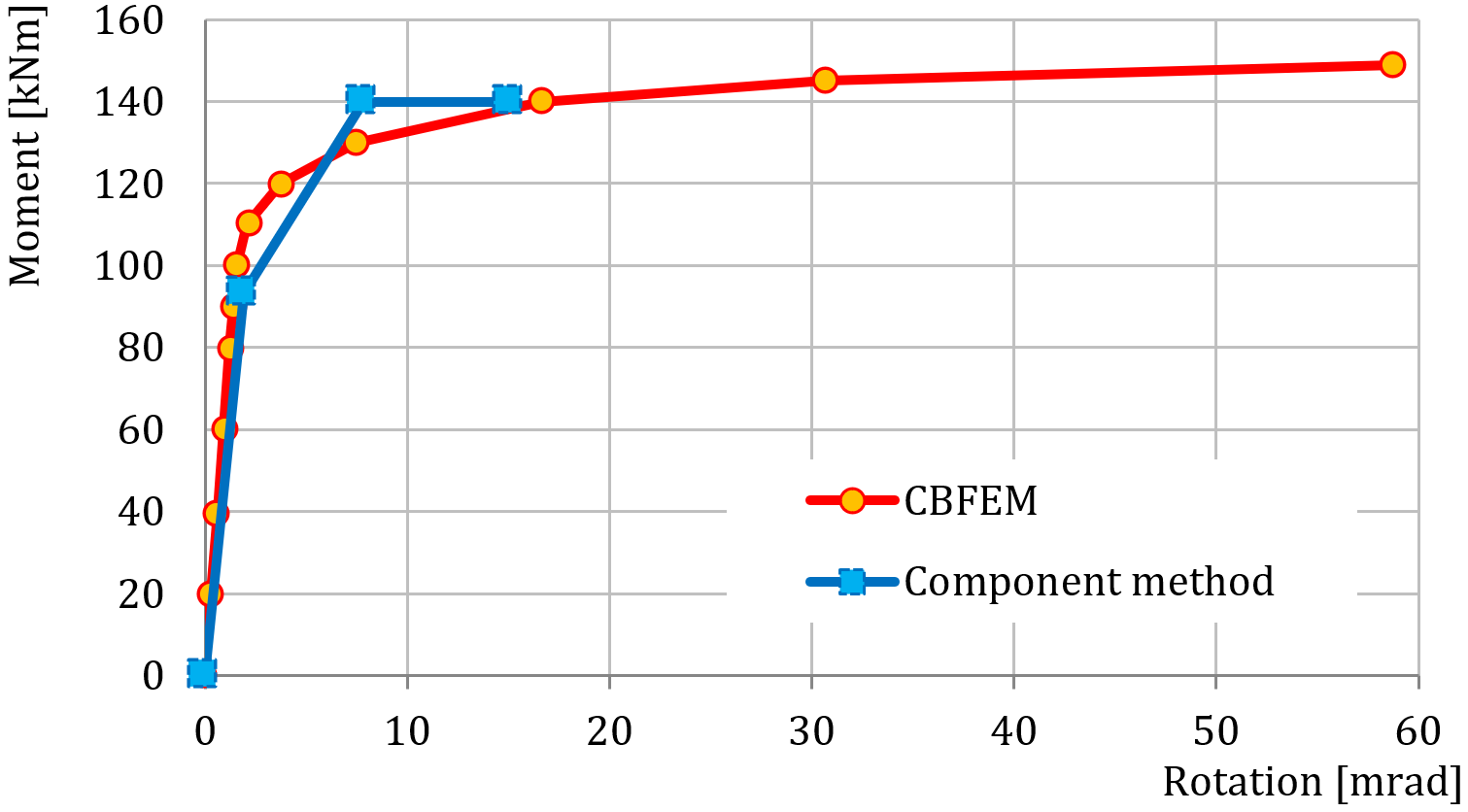 Comparison of the global behavior of a portal frame moment connection, described by moment-rotation diagram, is presented. Main characteristics of the moment-rotation diagram are initial stiffness, elastic resistance, and design resistance. An open section beam IPE 330 is welded to a column HEB 260 in the example. A portal frame moment connection with horizontal stiffeners in the column is considered according to component method as a rigid joint with Sj,ini = ∞. Therefore a joint without horizontal stiffeners in the column is analyzed. The moment-rotation diagram is shown in Fig. 9.1.2, and the results are summarised in Tab. 9.1.2. The results show very good agreement in initial stiffness and joint global behavior.