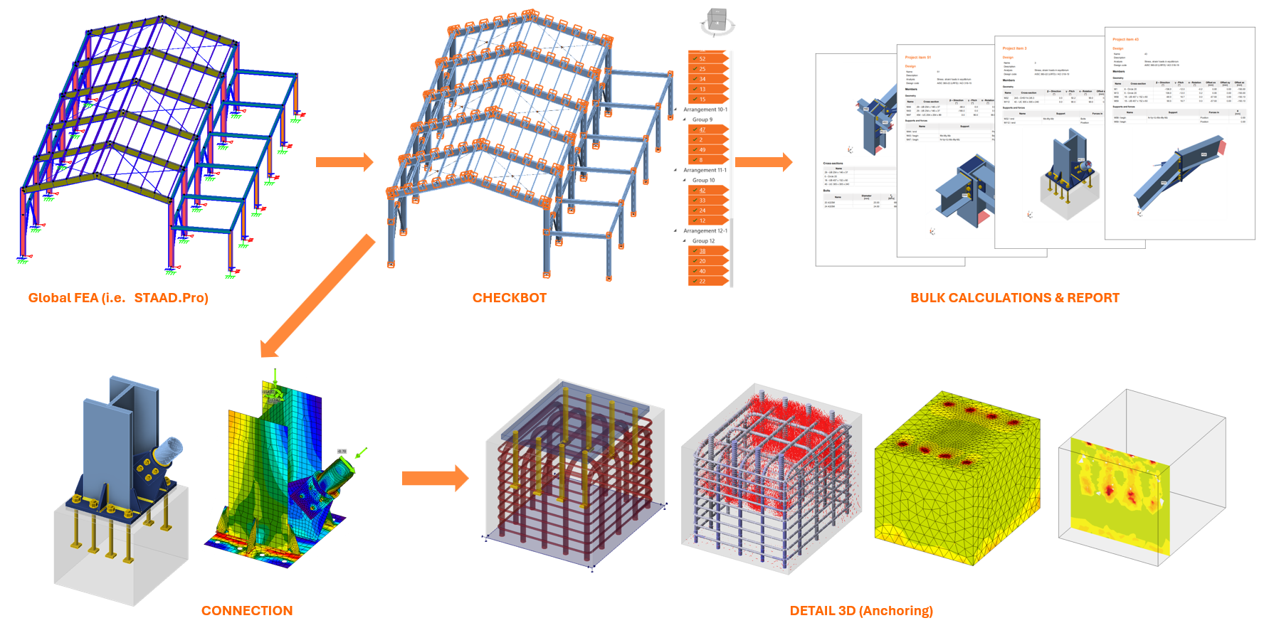 In this webinar, we will demonstrate the practical method to simplify steel connection design and anchoring workflow using IDEA StatiCa Checkbot. Starting from your global FEA analytical model, engineers will learn how to reduce their workload designing connections through automatic connection grouping, usage of predefined templates from connection library, analyze connection in bulk and automate repetitive task to boost productivity.