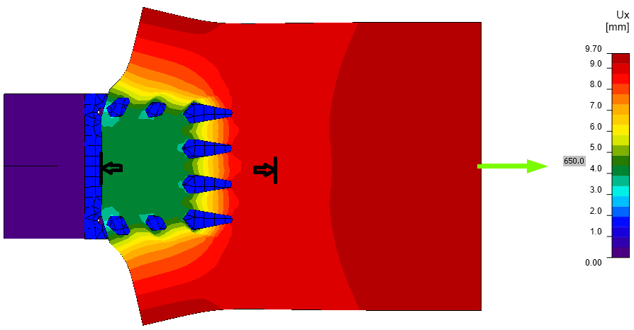 The deformation of CBFEM is read from similar locations as in the experiment in a developer mode, where displacements may be visualized. The values are read from the scale so the deformations are not exactly precise.