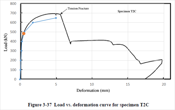 It is important to note that the 5% limit plastic strain (orange dot in the graphs below) is reached at very small deformation and long before any fracture. The tensile fracture occurs at 45% and 42% plastic strain for geometry T1 and T2B/C, respectively. The shear planes are even more ductile but the load resistance is already decreased significantly.