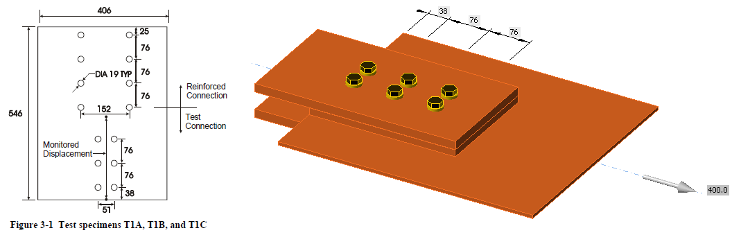 • Bolts with larger spacing, 152 mm (specimens T2B and T2C)