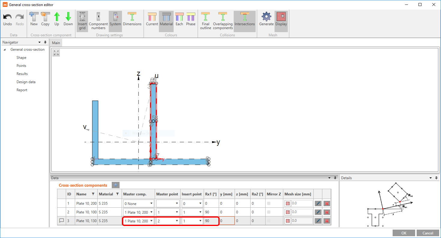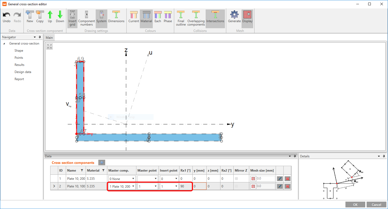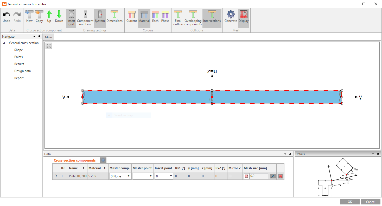 The general cross-section editor provides the calculation of the geometrical properties of the cross-section using numerical methods. Nevertheless, the mesh which can be displayed here does not correspond to the mesh created during the stress/strain analysis of the loaded connection. Therefore, some results of stress provided by the General cross-section editor may differ from the ones from the analysis of the connection.