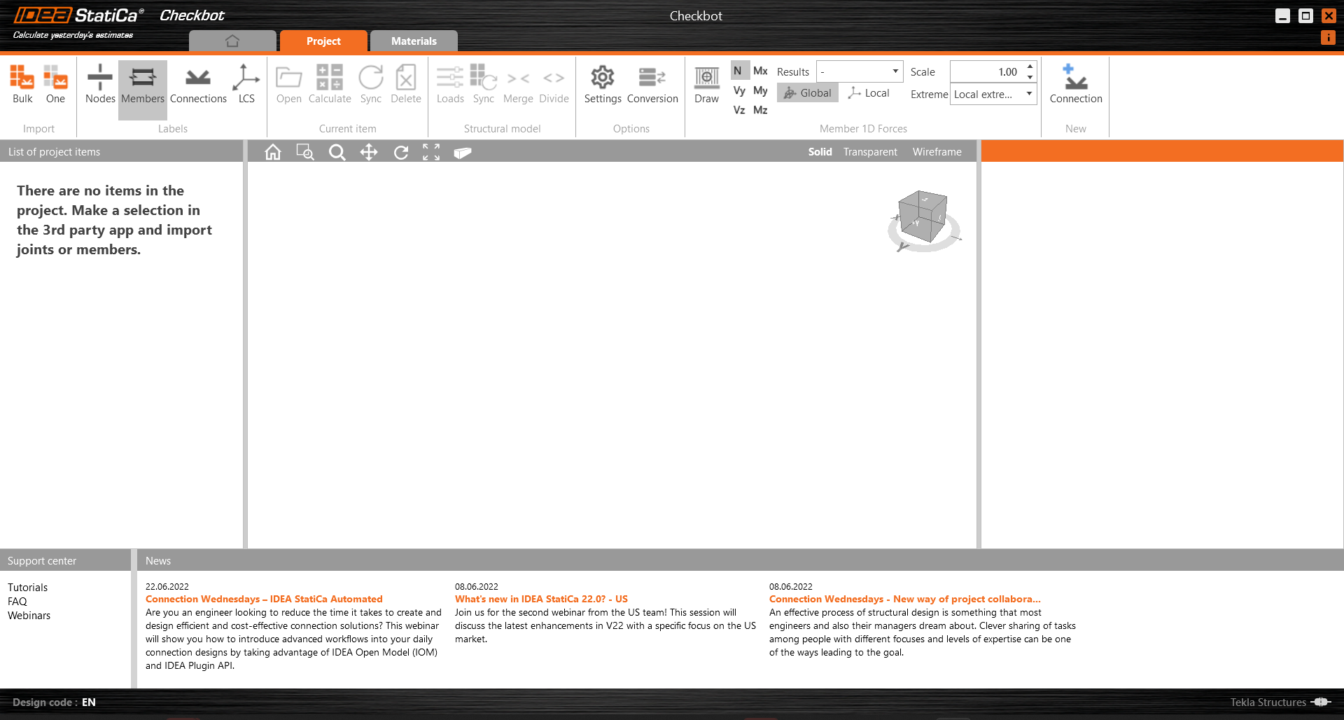 The new Checkbot project is ready to import connections from Tekla Structures.
