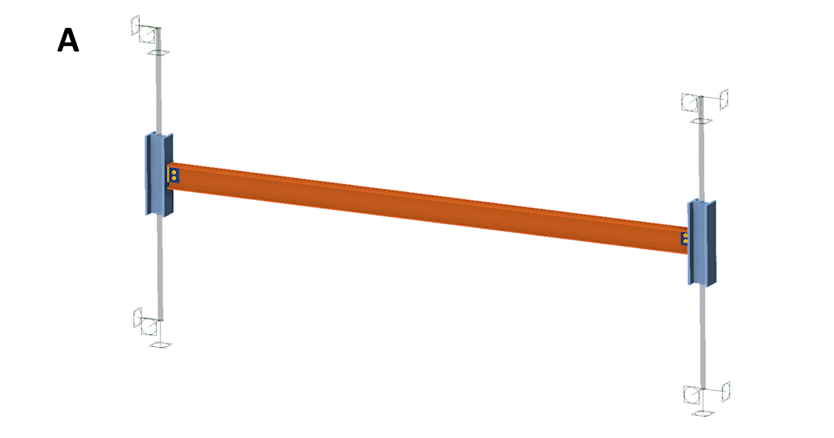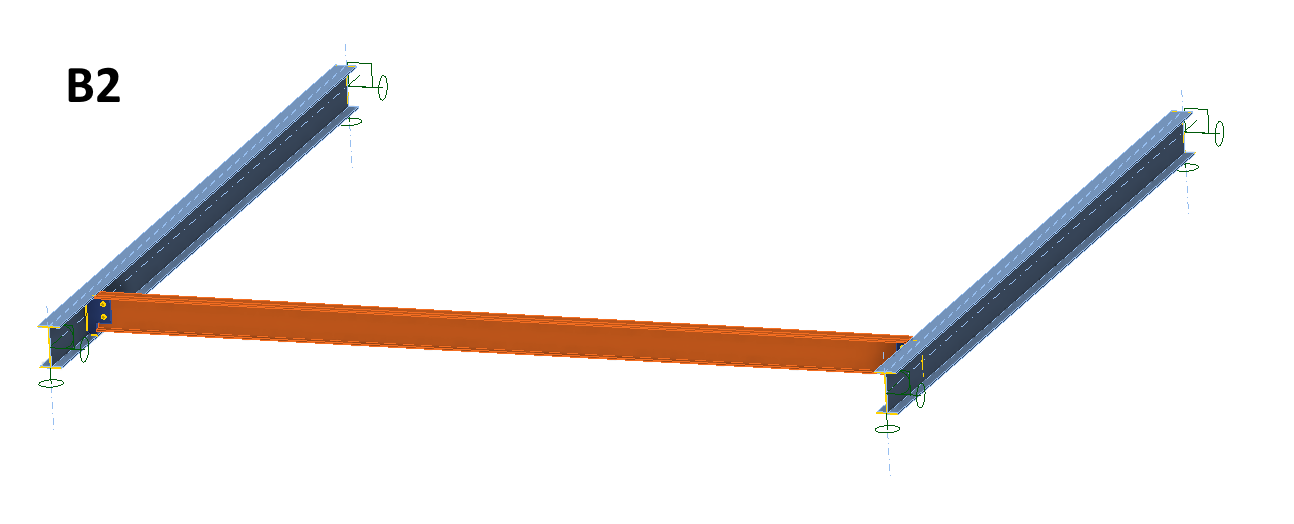Lets look at second shear connection design example. Connection B is another type of simple shear connection, that is often used in steel structures. In this case, the I-beam is connected to the perpendicular supporting girder with the I-section. Typically, this may be a connection of a ceiling beam to the edge girder. Assume that the ceiling itself does not consist of a rigid floor slab. Plus, the horizontal movements of the top flange of the supporting girder or the twisting of the girder section are not restricted. The girder is supported at the ends against torsion. However, the torsional compliance of the girder causes the response of connection B to be significantly different compared to connection A.