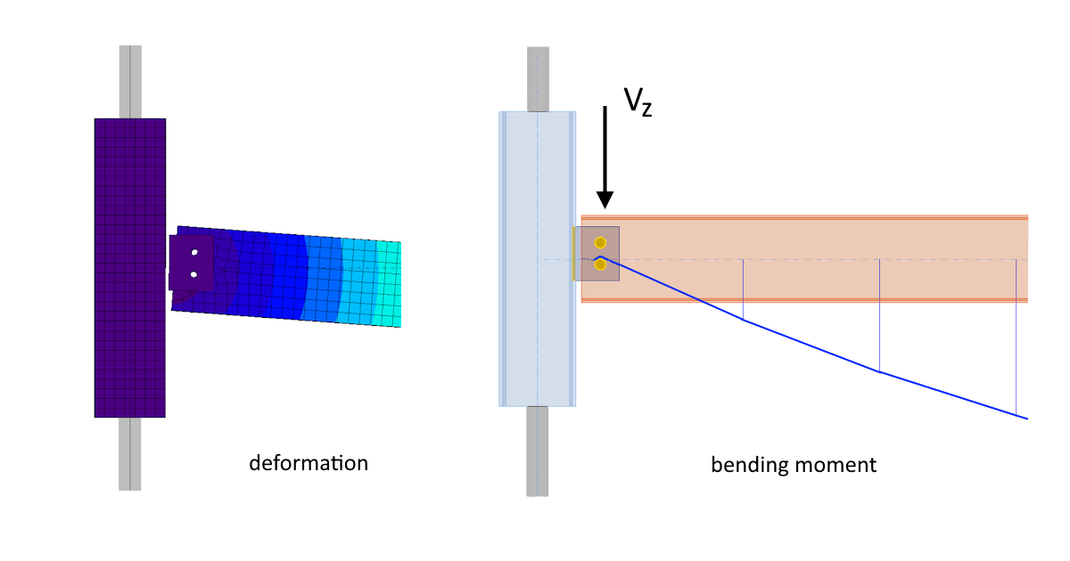 One may argue that the described behavior of shear connections is only a hypothesis and it would be good to support it by calculation. Therefore, we will now verify the presented behavior of the connections using the IDEA StatiCa Member application. IDEAStatiCa Member allows us to model the behavior of steel structures, or their parts, very accurately. The individual members, beams, and columns are modeled in 3D using shell elements. The connections between the elements are modeled using a Component-based Finite Element Method (CBFEM) model.