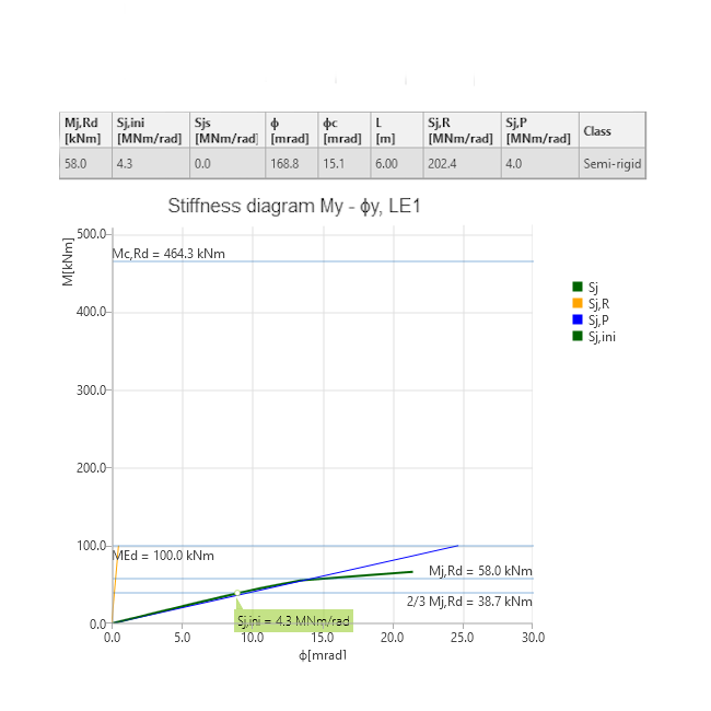 If the connection is categorized as pinned and has sufficient rotational capacity, the simplification of the small bending moment transmitted by the connection can be neglected. The distribution of internal forces in the connection can then be considered in the same way as for a type A connection. If the engineer decides to design the connection without this simplification, or if the connection is classified as semi-rigid, the calculated rotational stiffness of the connection must be included in the global analysis model. The bending moment in the connection is calculated then and the connection is checked for shear and moment using the Connection app.