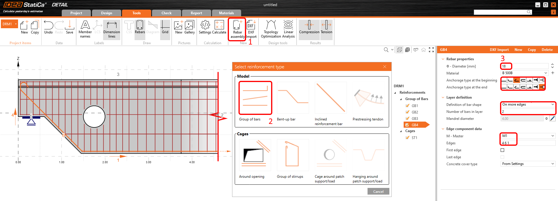 To add a new reinforcement item, use the Model entity button and select the Group of bars.