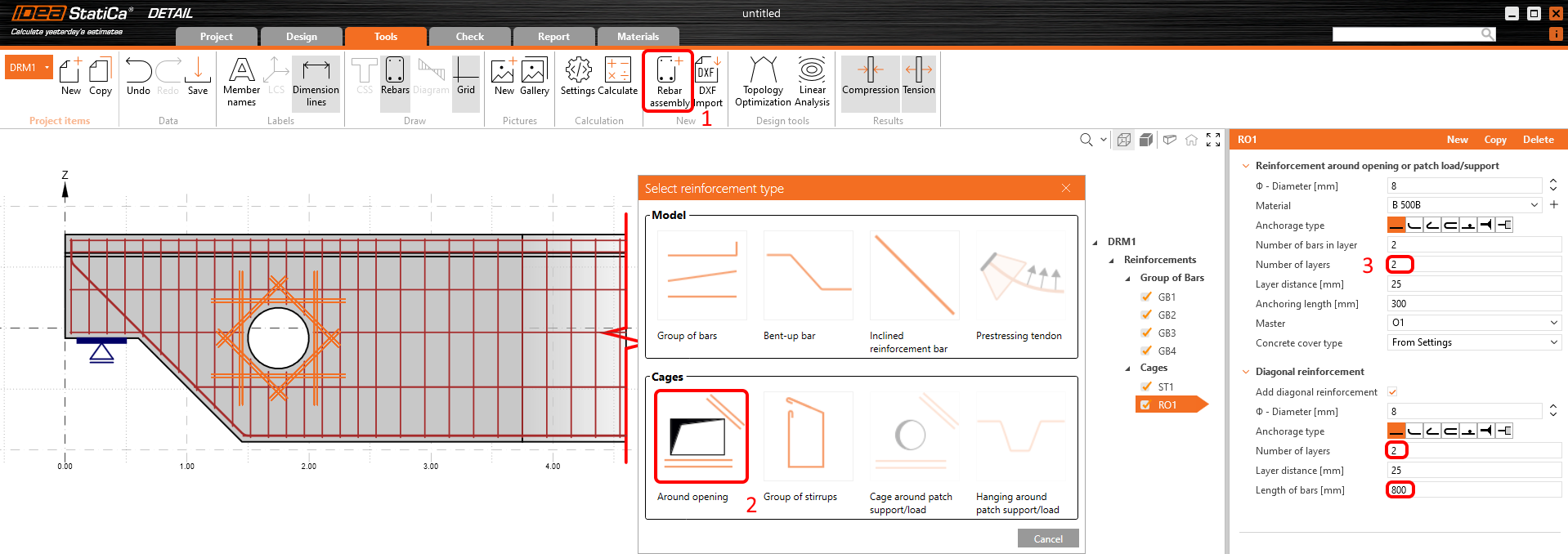 You added the opening to the original template and thus you need to add reinforcement around it. Again, press Model entity button and in Cages we select Around opening.