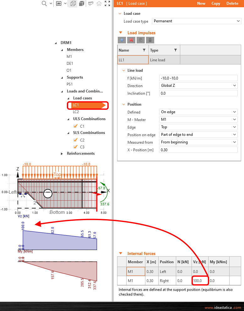 Modify load case LC1 for permanent effects. Apply reaction as a shear force 100 kN Vz from the right position. You can see the change in the internal forces diagram.