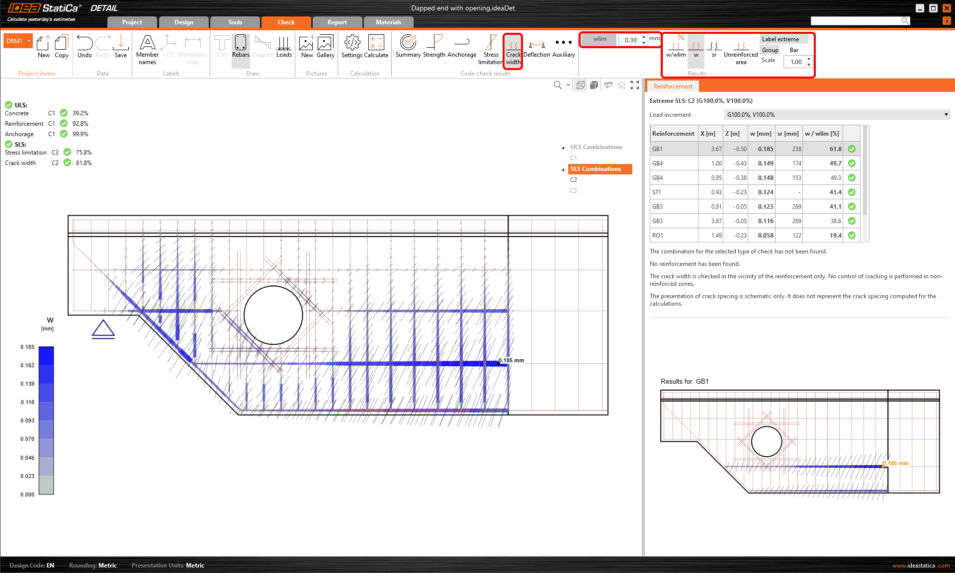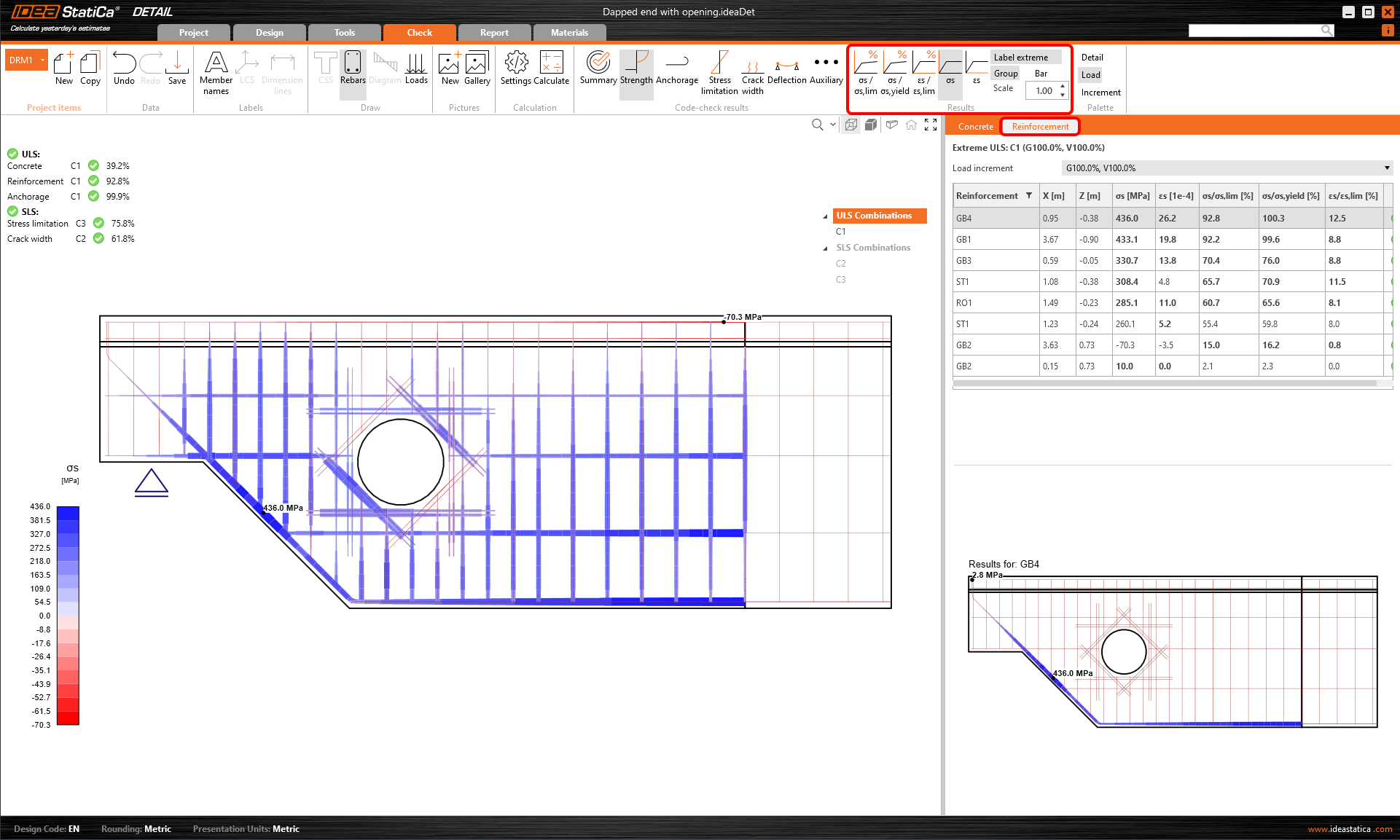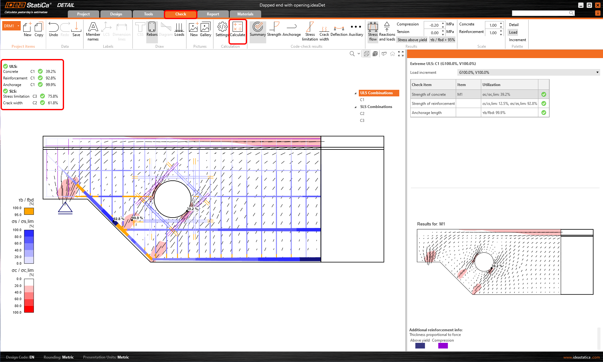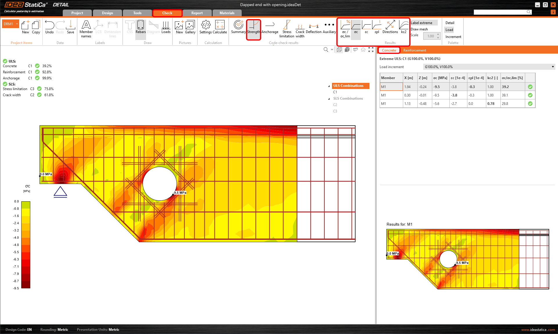 To go through detailed checks of each component, start with the Strength tab. This will show concrete checks such as utilization in stress, principal stresses, strains, and a map of reduction factor kc which can be switched on the ribbon.