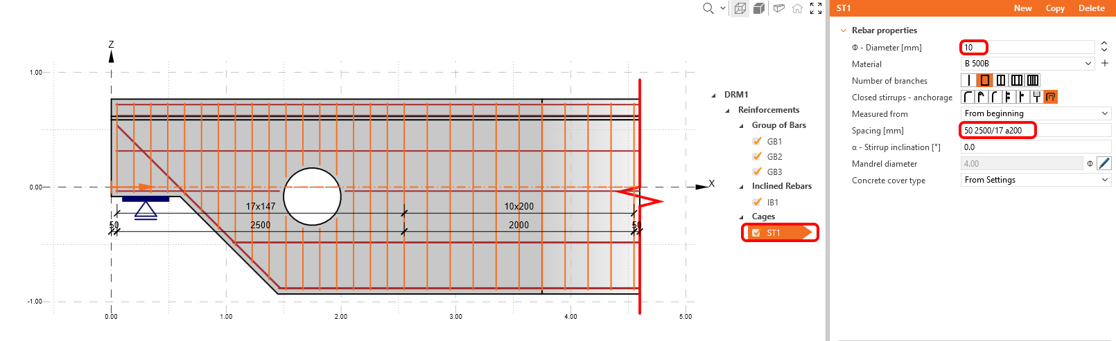 First item ST1 is used for stirrups modeling. Modify the diameter of the stirrups to 10 mm and change the distances between stirrups as 50 2500/17 a200. As you can see, you can combine several definitions of distances. This means, that first stirrup is positioned 50 mm from edge, then we fill 2.5 m by a division of 17 and fill the rest per 200 mm distance.