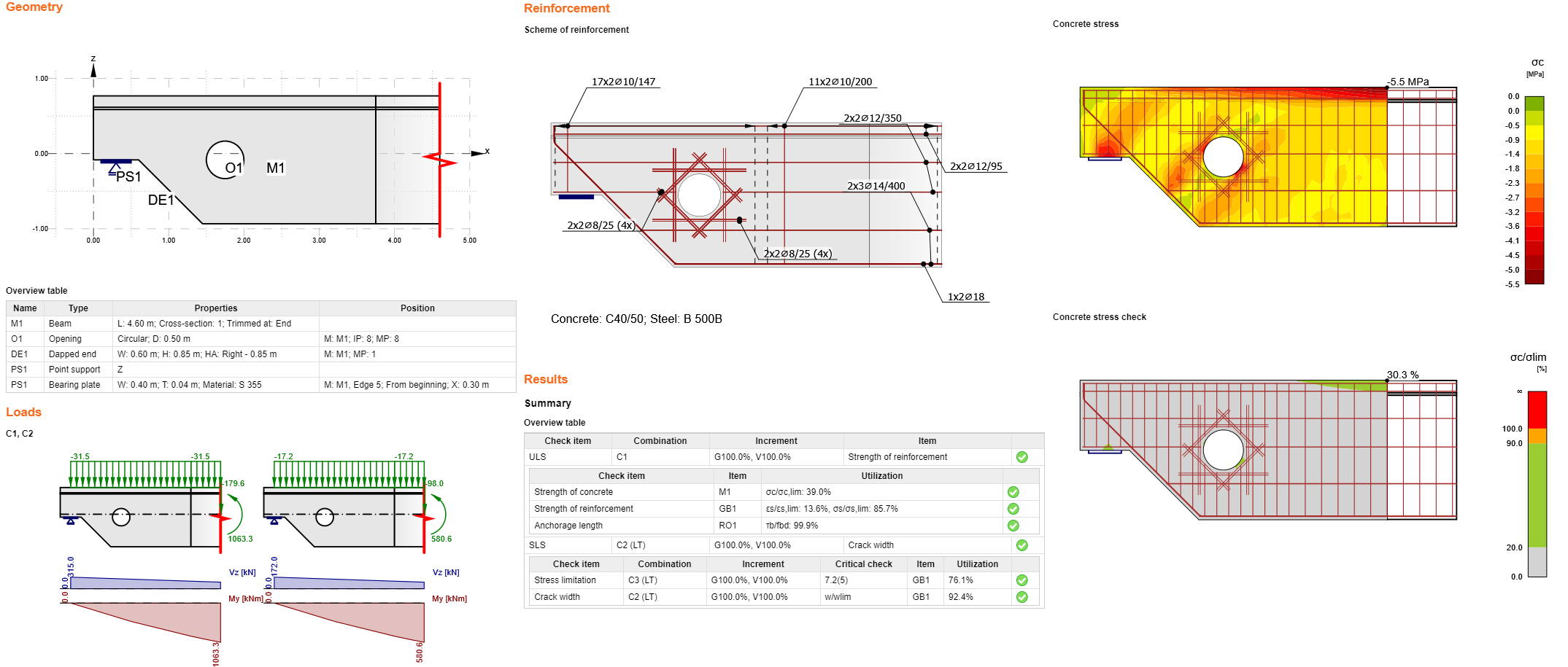 You have designed, optimized, and code-checked a dapped end with an opening according to Eurocode.