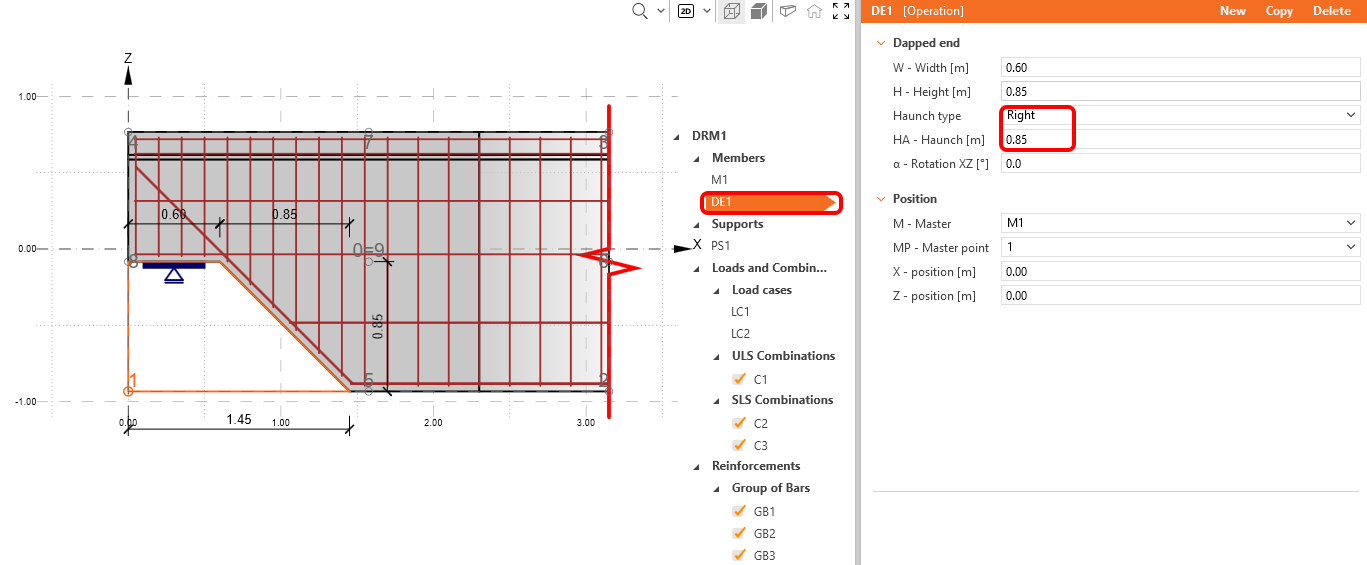 Start with the modification of geometry. Three items have been loaded by the template: Member M1 dapped end DE1, and point support PS1. We click on DE1 and choose right-sided haunch with 0.85 m width.