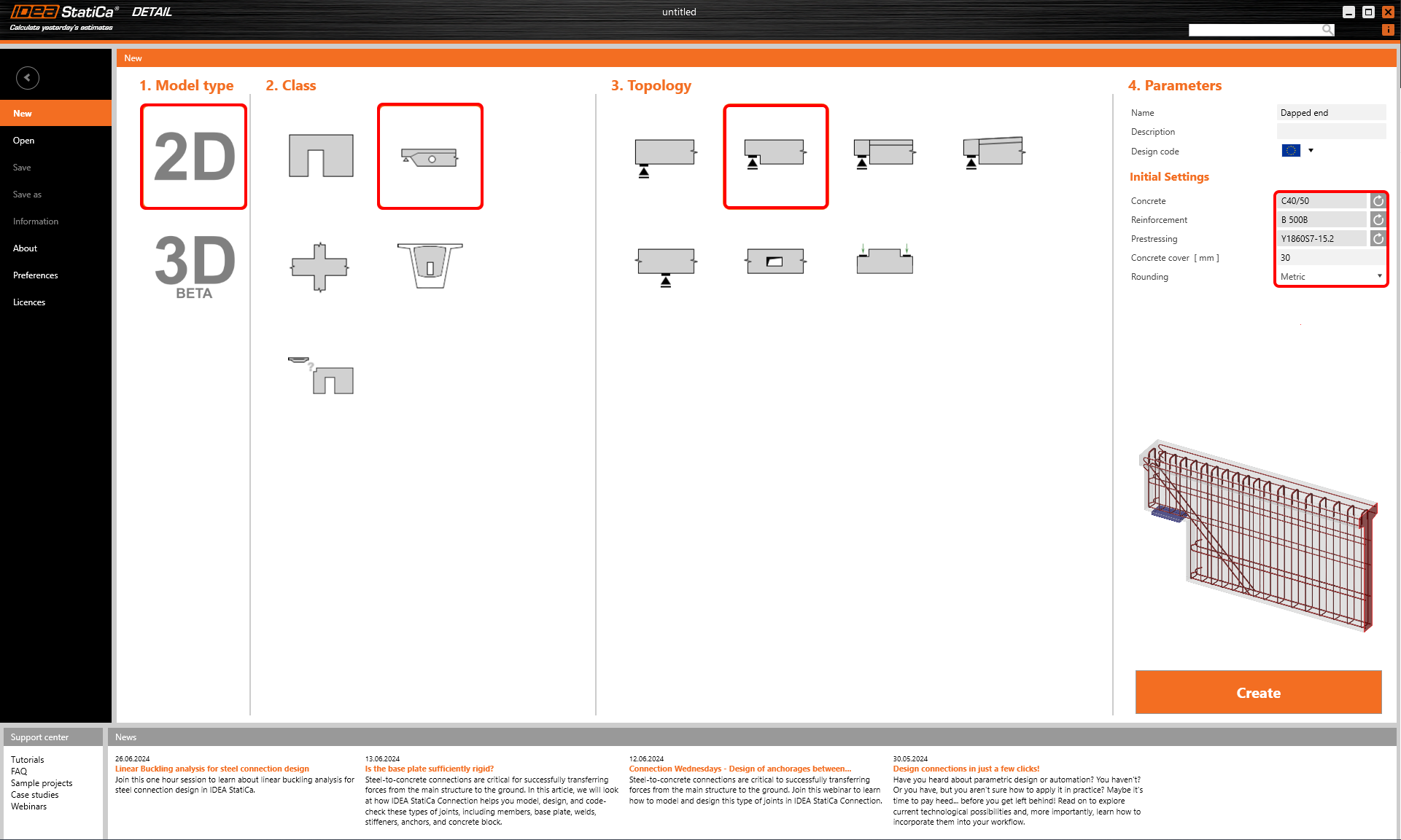 Start by launching IDEA StatiCa and select the application Detail. Create a new project you can start with a selection of proper concrete grade C40/50 and cover 30 mm. Then continue with Members 2D topology. In Members 2D templates, select Dapped end, one css
