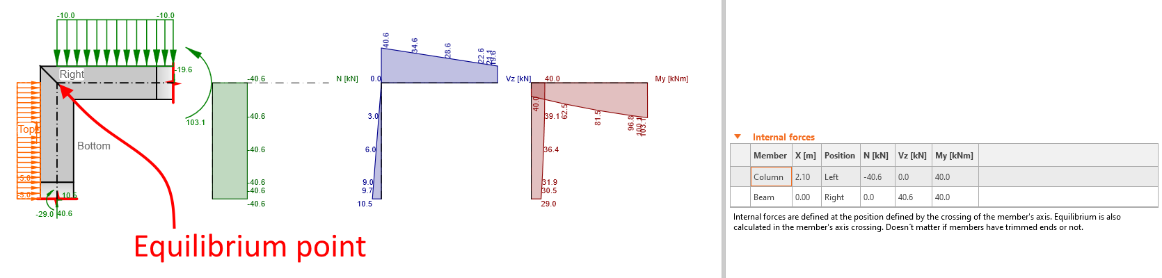 In the case of a frame joint, the equilibrium point, hence the position of the internal forces definition, is in the members' axis crossing - the node in the global model. Neither inclination nor joint type affects the definition of the equilibrium point.