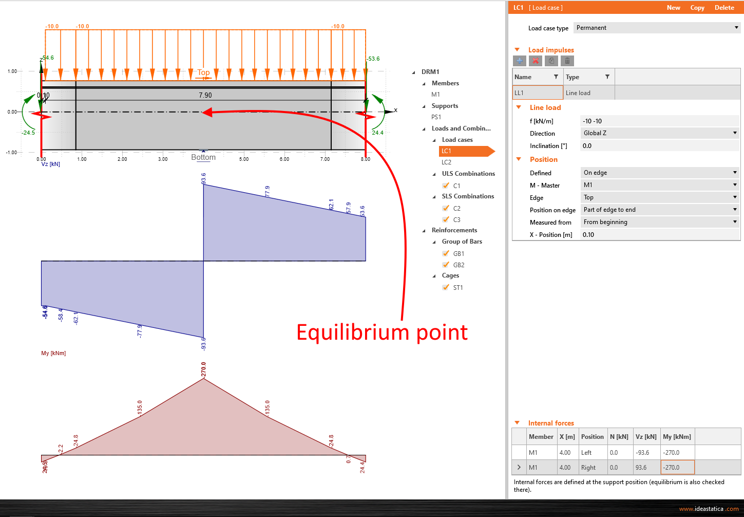 For this type, the equilibrium point is again placed above the support, and the approach is almost the same as in the case of the edge support example. The only difference is in the input of internal forces. You have to set them from both sides of the support. The correctness can be checked by looking at the internal forces diagram, and the reaction in the support - this value ought to be the same as the absolute summation of shear forces.