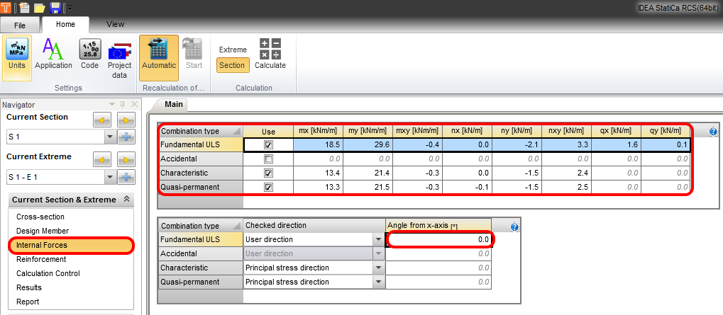 Copy+Paste or Manual input can be used for filling out the tab. The angle from the x-axis serves for the recalculation of designed internal forces from the basic ones, which are inserted into the tab.