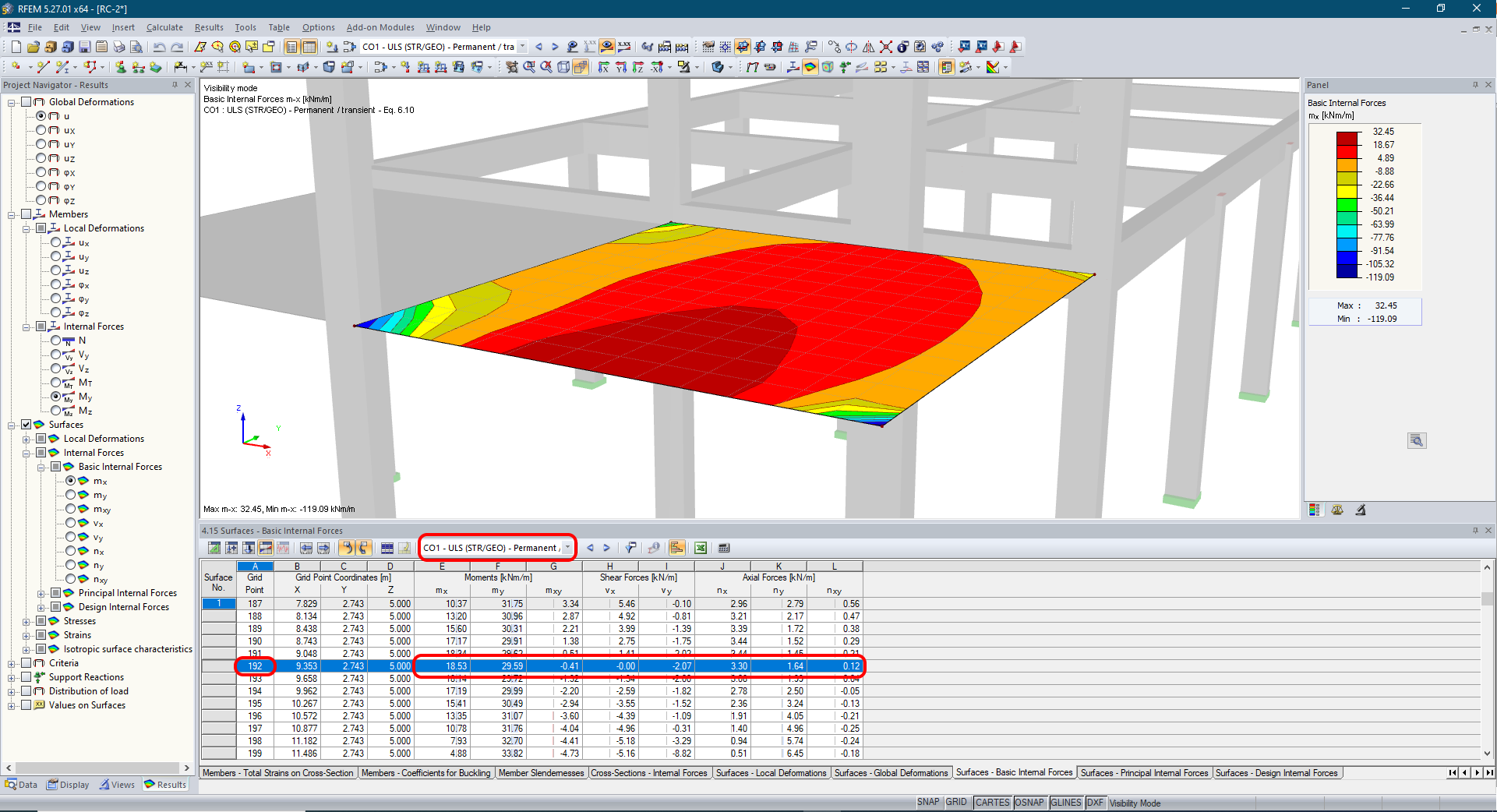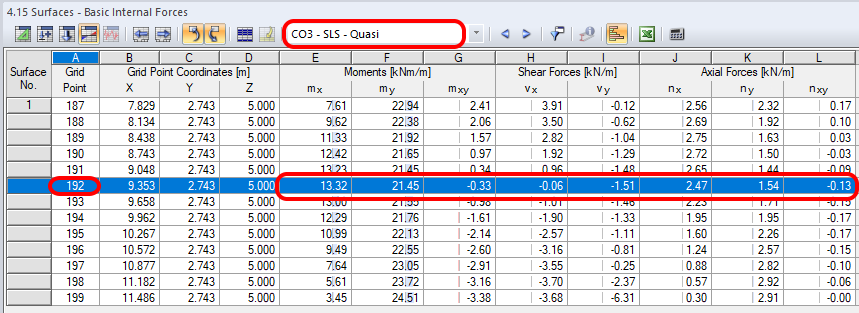 The code check will be performed in Grid point 192. The internal forces from the ULS combination CO1 are enclosed in the postprocessing results.