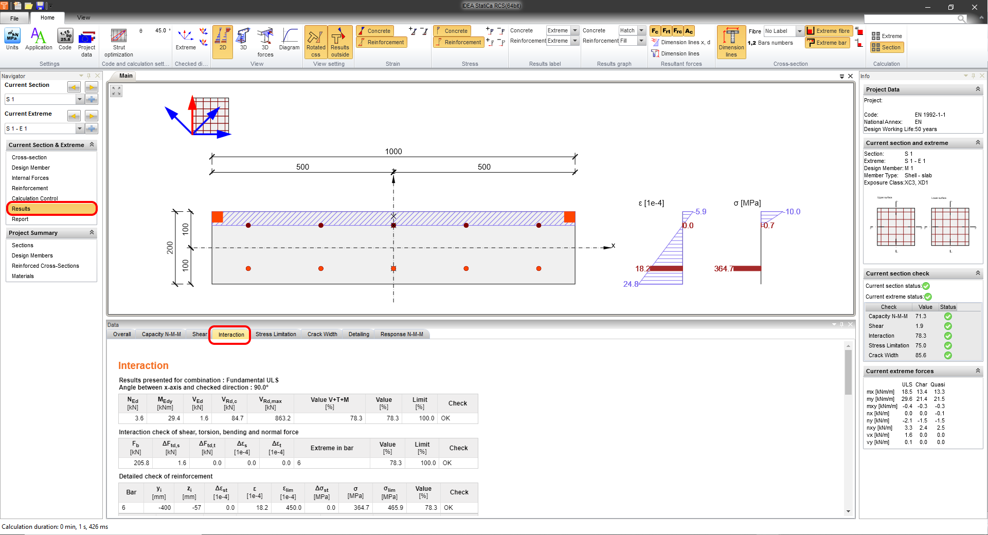 You can display the results for ULS and SLS in very detail. The activate red arrow mentions which direction you are looking at. Stress and strain redistribution over the height depicts the behavior of the analyzed element.