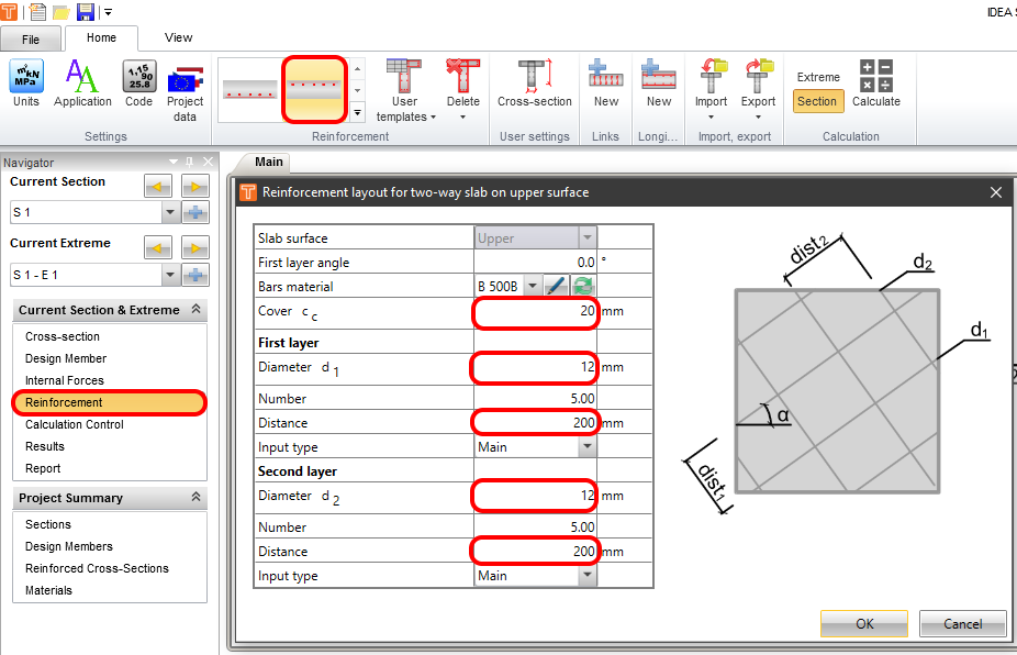 The predefined template of reinforcement helps with swift predesign. The bottom and upper layers of the rebars define according to the figure below.