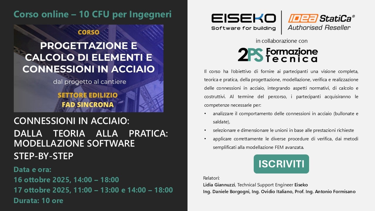 Scopri come IDEA StatiCa sta trasformando la progettazione delle connessioni in acciaio e la progettazione del calcestruzzo grazie alla sua tecnologia brevettata, all'interfaccia utente intuitiva e potente, alle verifiche complete dei codici di progetto e alle relazioni completamente personalizzabili e affidabili, in conformità con gli ultimi standard AISC, Eurocodice e altri standard nazionali.