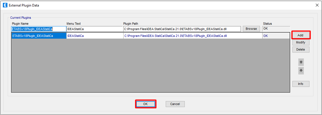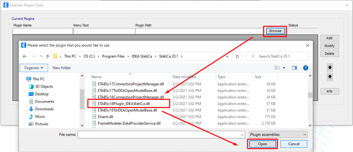 Successivamente, fare clic su Sfoglia e caricare il file memorizzato qui: C:\Program Files\IDEA StatiCa **.*\ETABSv18PlugIn_IDEAStatiCa.dll