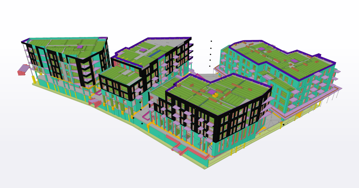 The structure is designed as reinforced concrete. The vertical load-bearing system is composed of prefabricated concrete walls with general shapes, while the horizontal load-bearing systems consist of hollow core slabs supported by prefabricated concrete elements or steel elements. Several buildings face the street, requiring code checks for potential car crashes and their impact on structural integrity.