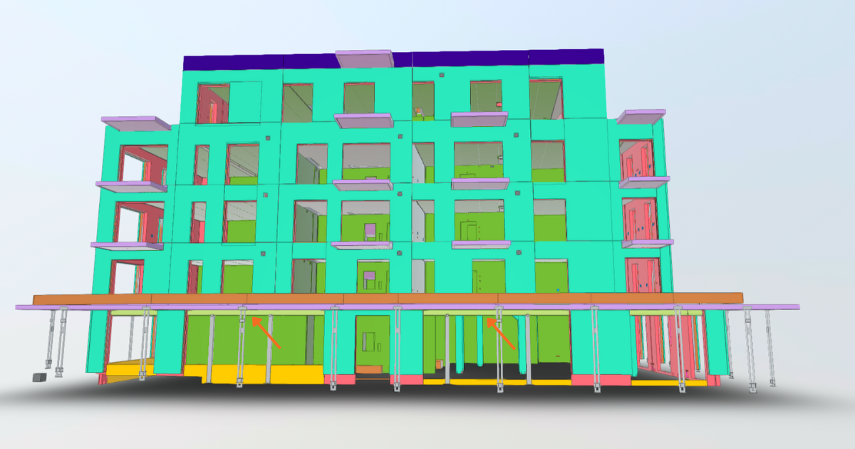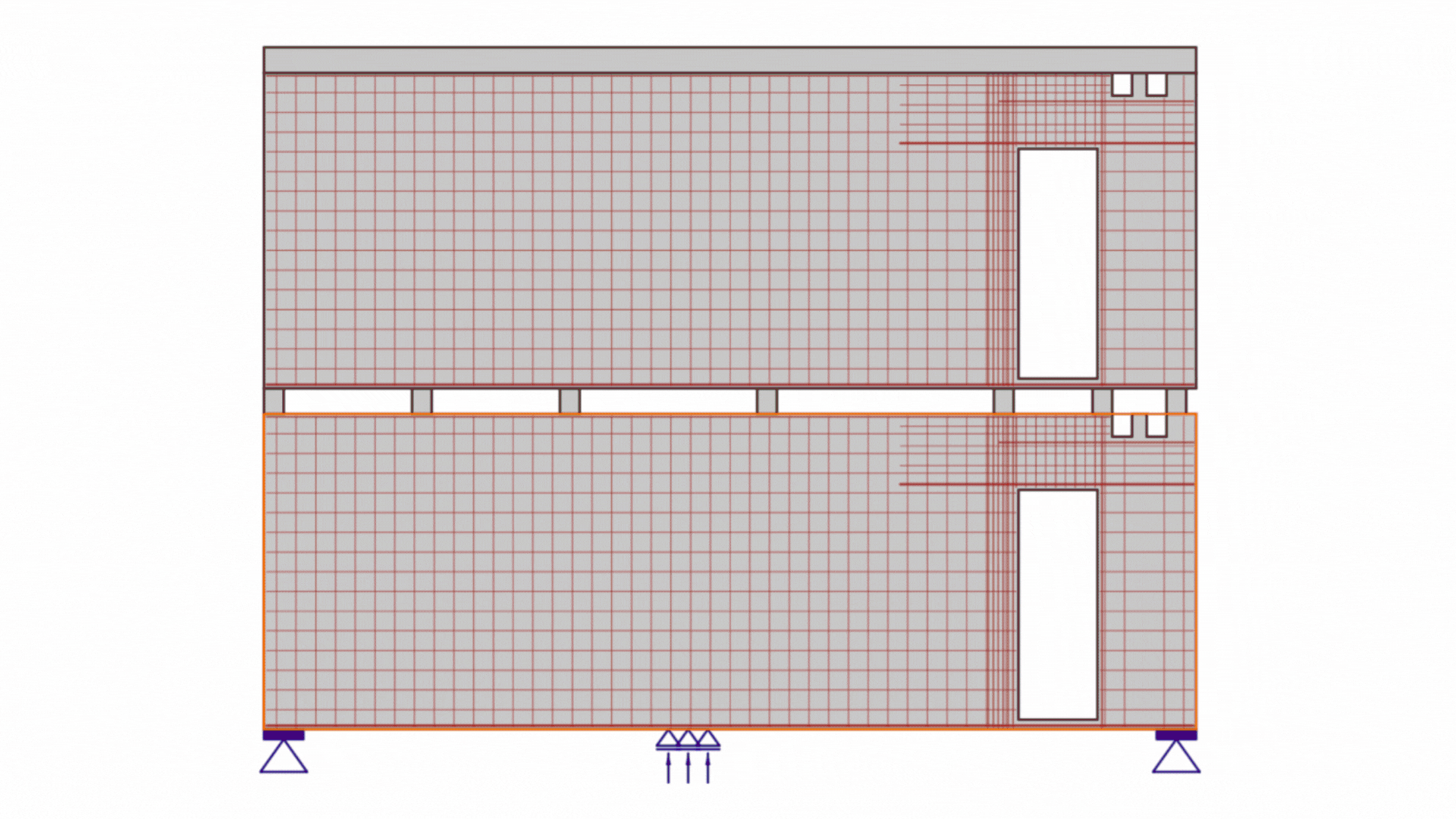 Engineer Artur Andersalu utilized walls weakened by openings for doors and windows. He could easily determine boundary conditions, such as the steel column represented by the spring support acting in compression only and supporting walls represented by bearing plates for point supports. He also modeled the ceiling to account distribution of vertical loads from the upper floors to achieve more accurate stress flow according to the geometry and loads. Significant stresses occurred in the corners, which led to additional reinforcing to avoid wide cracks. Furthermore, he could determine and code-check deformation.