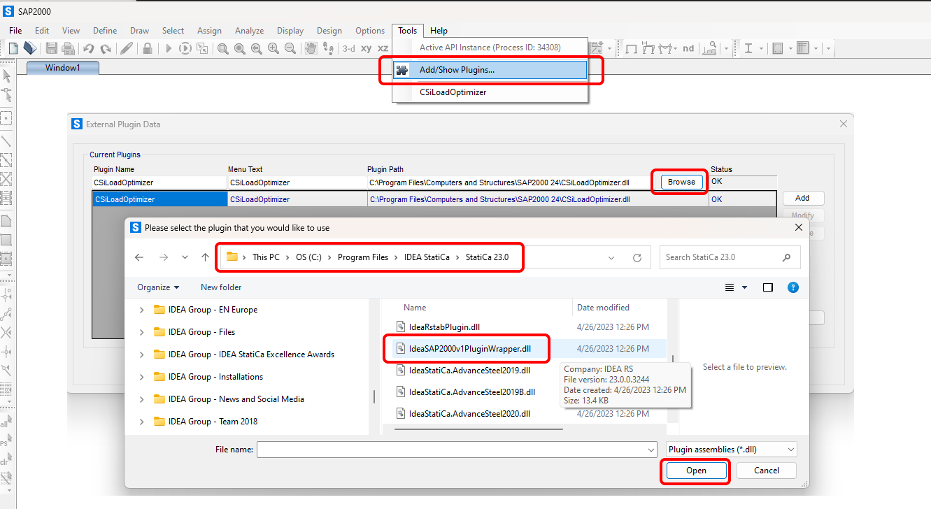 - Seleziona il plugin del Checkbot chiamato IdeaSAP2000v1PluginWrapper.dll (per le versioni precedenti di IDEA Statica, seleziona il plugin che si chiama SAP2000v21PlugIn_IDEAStatiCa.dll)