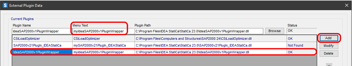 - Modifica il nome del plugin visualizzato nella colonna Menu Text e scrivi IDEA StatiCa Checkbot