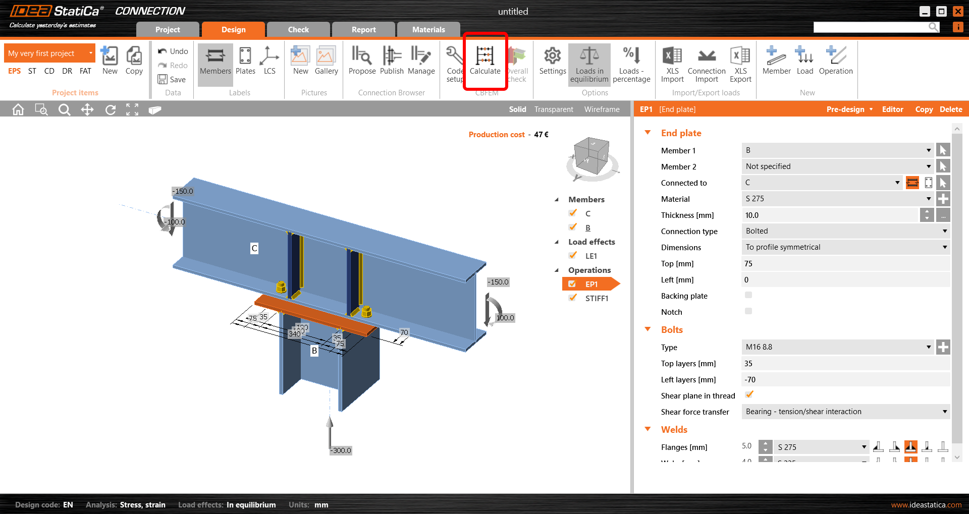 In the third section of the tree, there are manufacturing operations defined. In the selected connection, there is an EP1 operation of the endplate and STIFF1 operation defining the stiffeners on beam C. Again, you can change any parameter of the selected operations or delete/add another one.