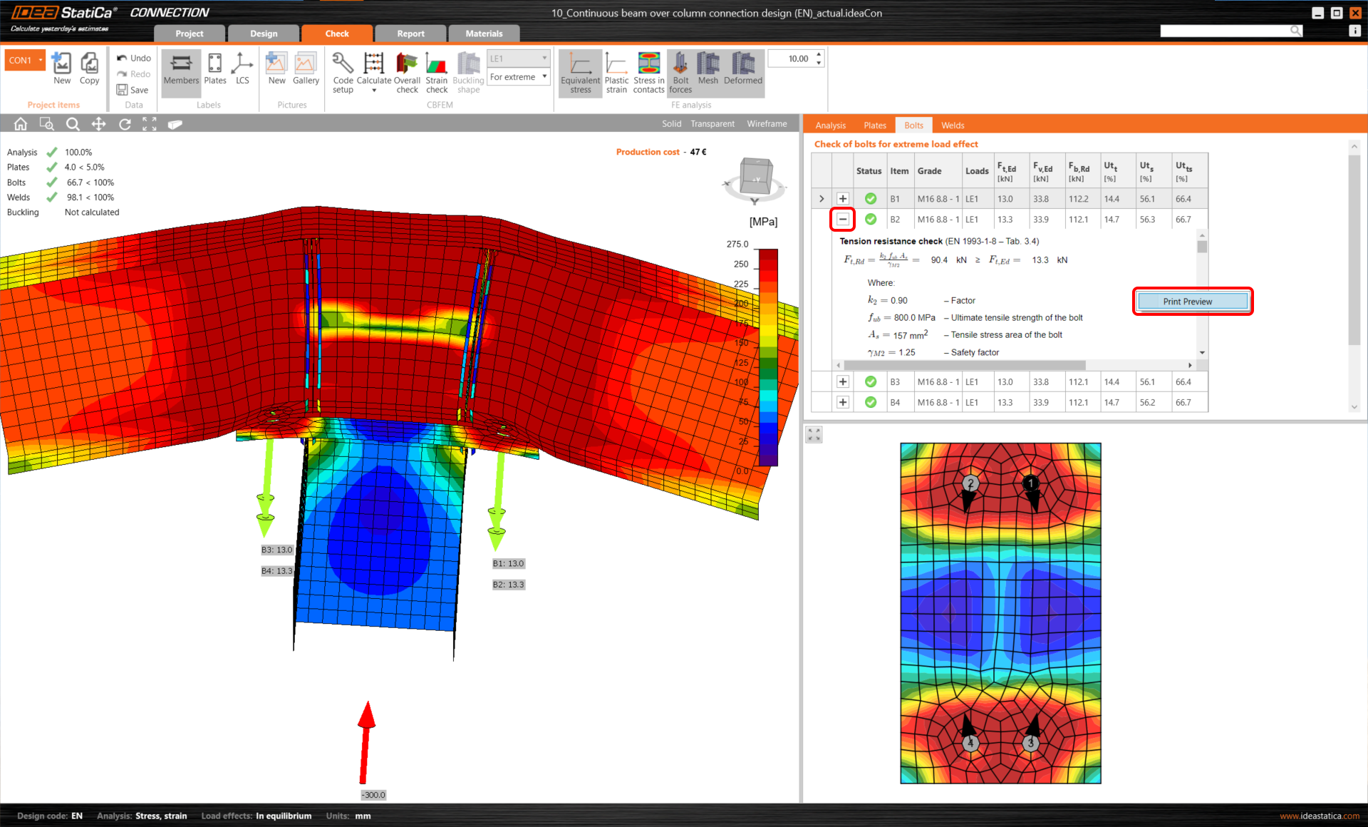 You can go through the results on each component of the connection. Let's start with Plates and investigate the Equivalent stress picture with Mesh and Deformed shape displayed.