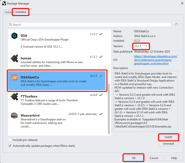 Appare una nuova finestra; selezionare IDEAStatiCa e fare clic su Installa. Il plugin verrà scaricato e installato. Per essere attivo, è necessario riavviare Rhinoceros.